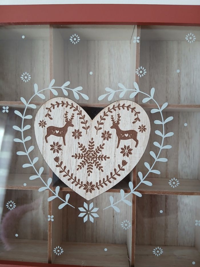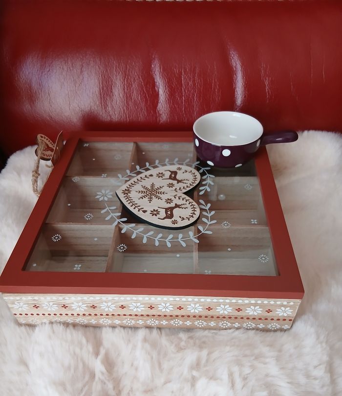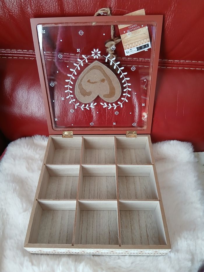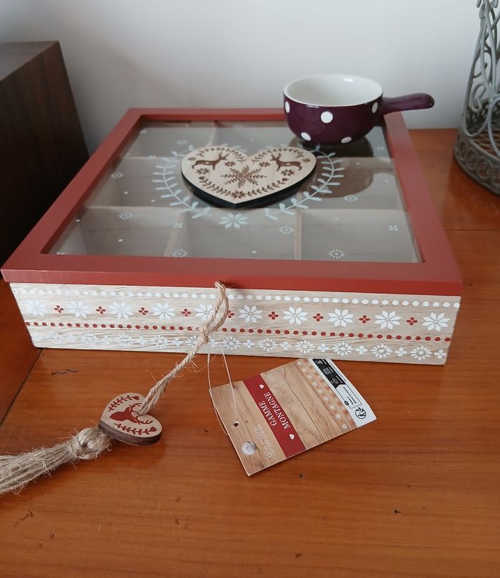 Articles Neufs; encore étiquetés. 1/ Dépose sachet de thé en céramique avec poignée. Diamètre de 7 cm; hauteur de 3,5 cm 2/ Boîte à sachets de thé en bois /panneaux de fibres à densité moyenne; gamme déco montagne. Couvercle avec encadrure en bois peint; centre en verre et cœur en bois coll; 3 côtés en bois peint avec motifs. 9 compartiments à l'intérieur. Ouverture par déco en bous peint et ficelle. Dimensions : 23, 8 X 23,8 X 6 cm. A Noter : les stries et les marques sur le bois sont inhérentes à la découpe du bois. Cela varie en fonction des morceaux. Dans le cas présent, il y a des marques sous le fond de la boîte. Bien tenir compte de ce paramètre [ pas de retour] // voir photos pour détails