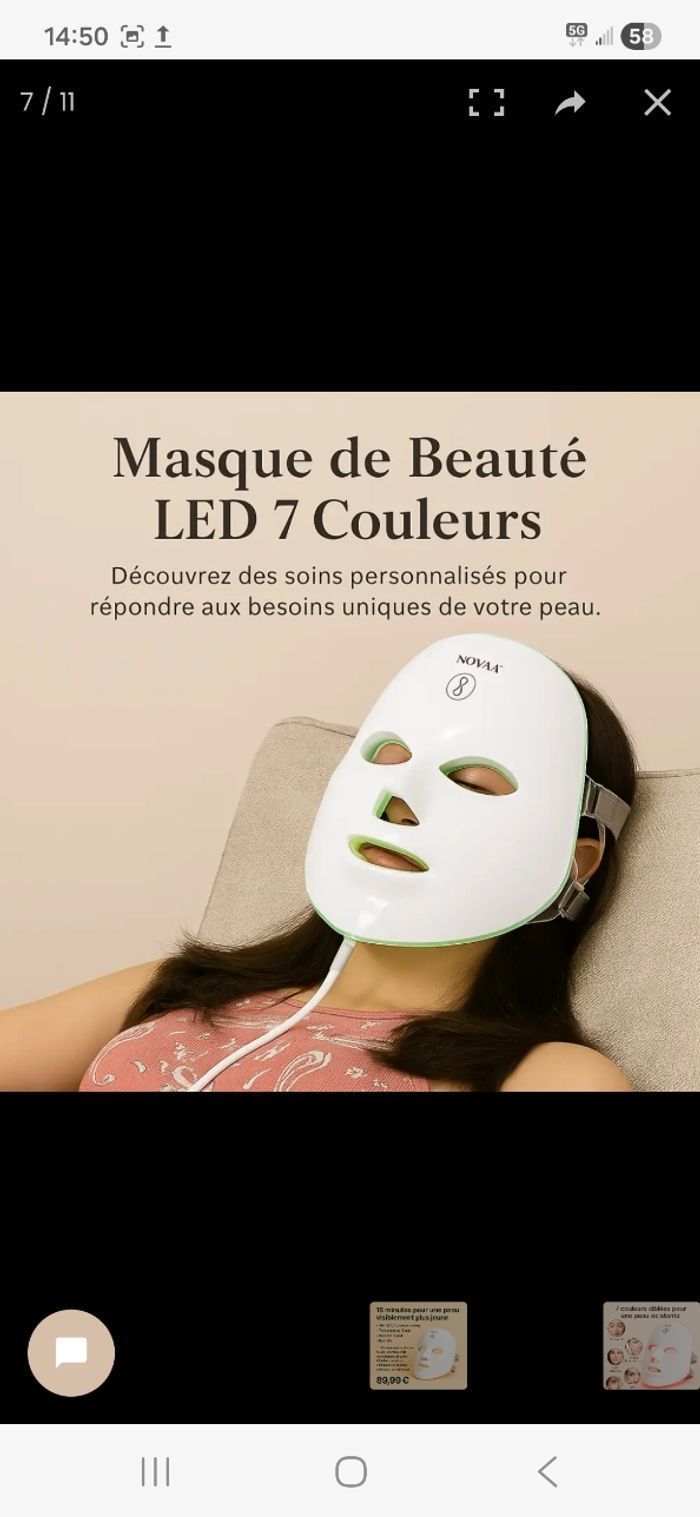 Bonjour à tous ☀️ Vente cause double emploi ce masque de beauté Led neuf jamais ouvert. 90€ n'hésitez pas à me contacter pour plus d'informations. Masque LED de Luminothérapie 7-en-1 🎭 Longueurs d’ondes : de 630 nm à 850 nm selon la couleur (traitement en profondeur) Envoi rapide et soigné 🔴 Rouge (630 nm) – Stimule la production de collagène et atténue les rides, en particulier autour des yeux et du front. 🔵 Bleu (470 nm) – Élimine les bactéries responsables de l’acné. Réduit les inflammations et les boutons, resserre les pores dilatés, diminue la brillance et l’excès de sébum. 🟢 Vert (520 nm) – Apaise les rougeurs, unifie le teint, et atténue les taches brunes et l’hyperpigmentation. 🟡 Jaune (590 nm) – Active la microcirculation, illumine le teint et améliore la circulation sanguine. 🟣 Violet (390 nm) – Combine les effets anti-âge et anti inflammatoires et répare la peau en profondeur. 🌊 Cyan (500 nm) – Calme les peaux sensibles, réduit les rougeurs et apporte une sensation de fraîcheur. ⚪ Blanc (850 nm) – Réduit les signes visibles du vieillissement en profondeur, rééquilibre la peau fatiguée ou affaiblie et booste la régénération cellulaire. Alimentation : Batterie lithium-ion intégrée (400 mAh), recharge par câble USB (inclus).
