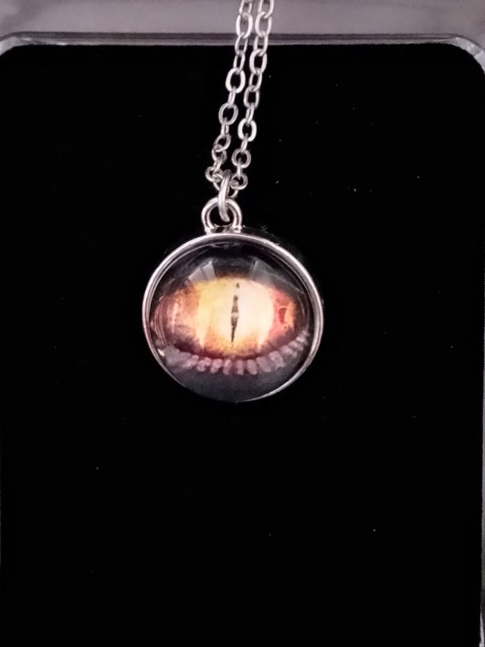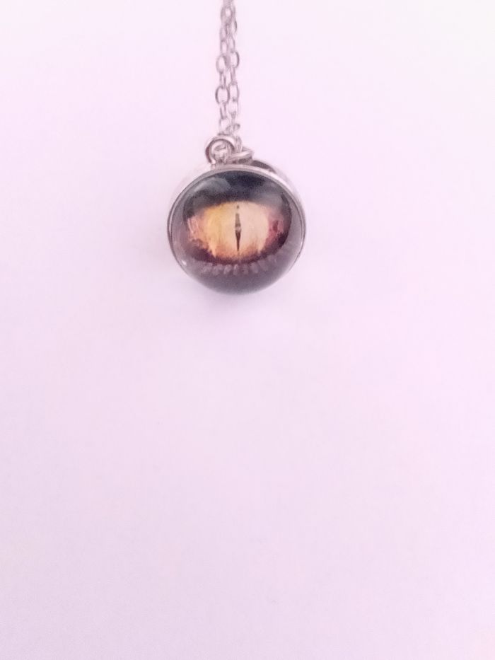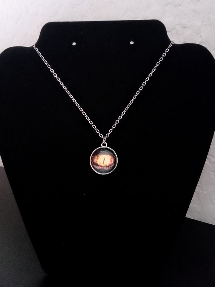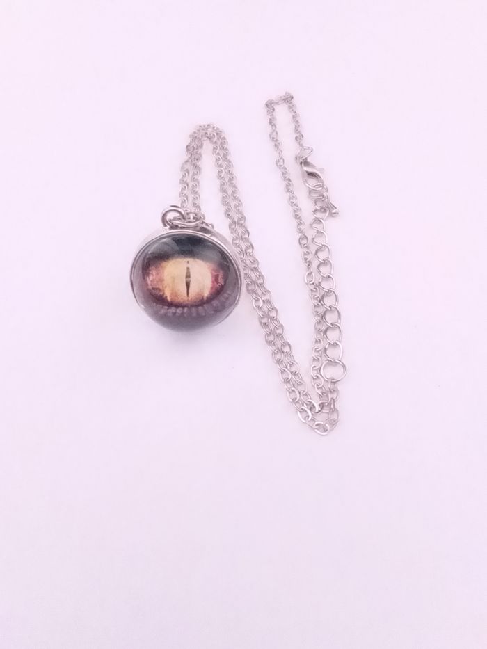 Chaîne + pendentif celtique. Pendentif : bille en verre cabochon, motif : oeil de dragon. (celtique, protection, spirituel, élégant, idéal cadeau) DESCRIPTIF : Les deux faces sont identiques. Couleur : argenté, jaune. Taille chaîne : 57 cm Diamètre pendentif : 2,2 cm L * 2 cm H Envoi rapide et soigné.
