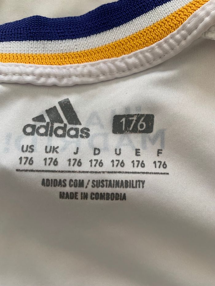 Maillot Real Madrid – Bellingham n°5 Taille 176 cm (équivalent S ado / XS adulte) Très bon état général. ⚠️ Micro fil tiré à l’arrière, peu visible (voir dernière photo). Envoi rapide. 📦 Préférence Mondial Relay. #realmadrid #bellingham #maillotfoot #adidas
