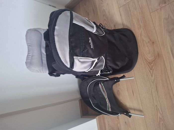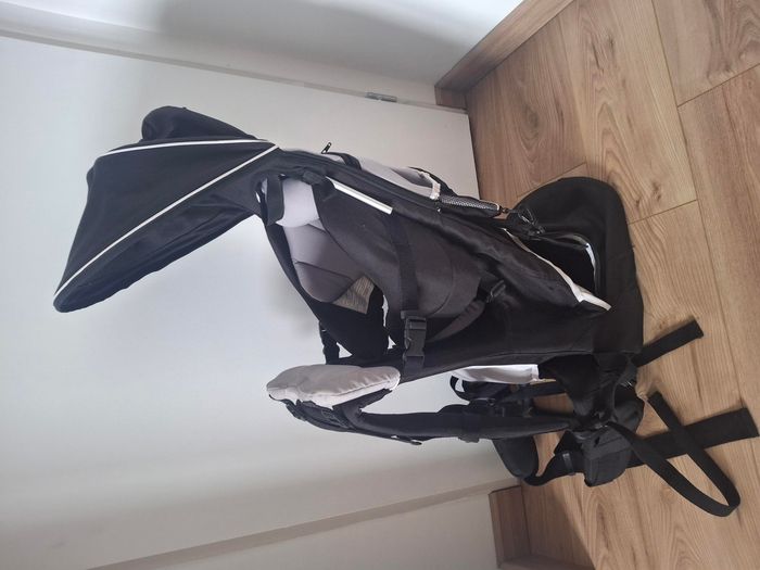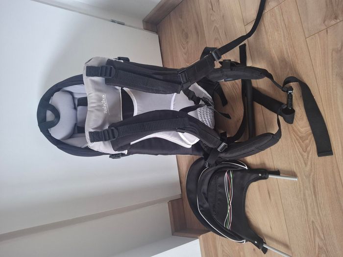 Porte bebe dorsal de marque Babybus pour randonnées. Il tient debout tout seul posé au sol. Une fermeture éclair d’une poche cassée.