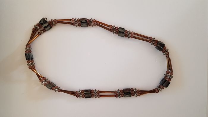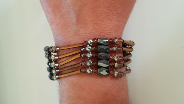 Se porte en collier ou en bracelet aimanté Perles en hématite synthétiques + marron et argentés Longueur : 90 cm Fait à la main, des défauts sont possibles Neuf, jamais porté