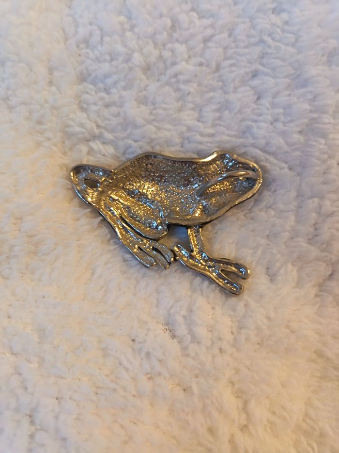 Ravissante broche en forme de grenouille arboricole au design détaillé et élégant. Style : Vintage / Cabinet de curiosités. Couleurs : Corps noir brillant (effet émaillé) avec des taches contrastées et reflets argentés/dorés. Détails : Travail de relief très soigné sur les pattes et les yeux. État : Très bon état général (voir photos pour le dos de la broche). Polyvalente : Idéale sur le revers d'une veste, un manteau, un chapeau ou même pour fermer un gilet. Un petit accessoire original qui apporte une touche de caractère à n'importe quelle tenue ! #skms62141_animaux #broche #grenouille #bijouvintage #accessoire #frog #brochevintage #animalier #bijoufantaisie #nature #boheme