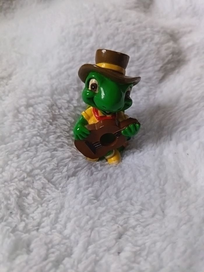 Avis aux nostalgiques et collectionneurs ! Je vends cette petite figurine de tortue musicienne, un authentique objet souvenir du Dennlys Parc. Détails : Tortue avec son chapeau de cow-boy, sa guitare et son socle fleuri. Provenance : Boutique du parc Dennlys Parc (vintage). Dimensions : 7 cm. État : ⚠️ Le bout du manche de la guitare est manquant (voir photos). Le reste de la figurine est en bon état général avec des couleurs encore bien vives. Idéal pour compléter une collection sur les parcs d'attractions français ou pour un souvenir d'enfance. #skms62141_decoration #dennlys #dennlysparc #vintage #figurine #tortue #souvenirparc #parcdattraction #collection #retro #pasdecalais