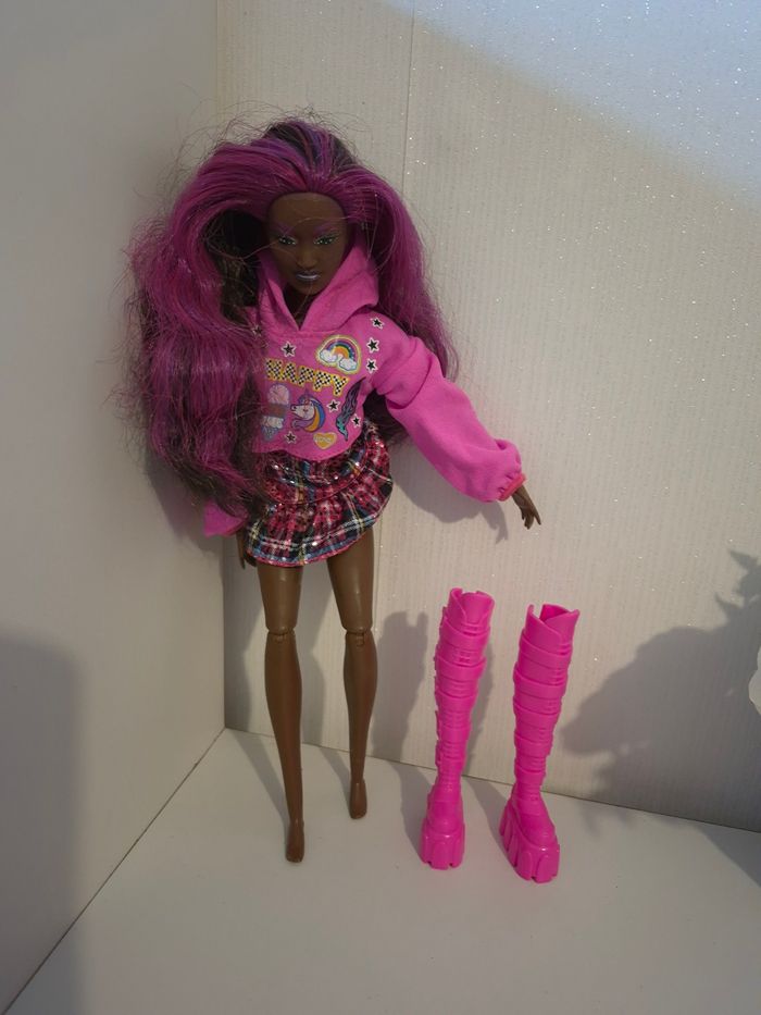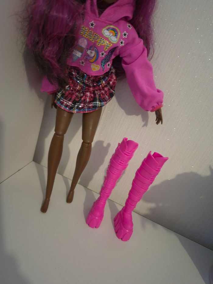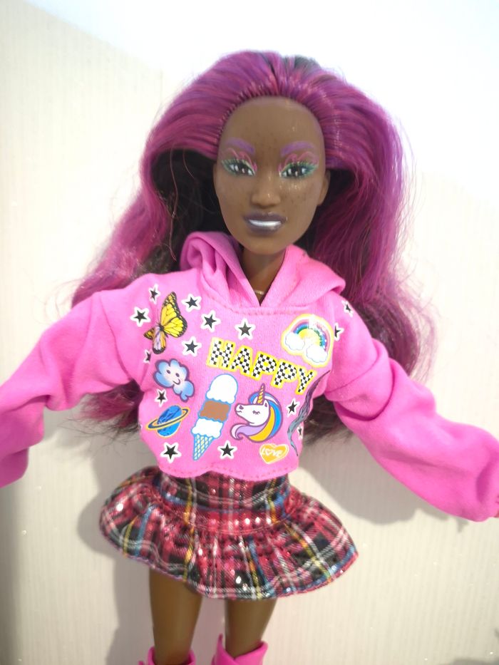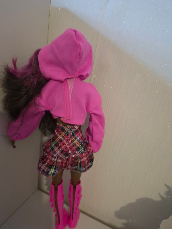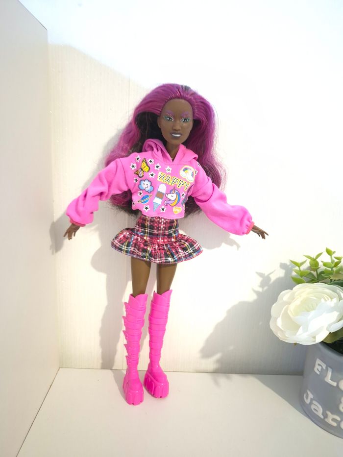 🌟 jolie poupée Barbie Extra "Fly" & Streetwear Mattel 2014/HKP93 ​Magnifique poupée Barbie Mattel au style unique et coloré ! Parfaite pour compléter une collection ou pour offrir. Elle possède un visage très expressif avec de jolis détails de maquillage et une chevelure violette vibrante. • ​Marque : Mattel (Authentique) • ​Modèle : Corps articulé (genoux, coudes, poignets) pour prendre de superbes poses. • ​Tenue incluse : * Crop-top hoodie rose "Happy" avec motifs licorne et arc-en-ciel. • ​Jupe courte à carreaux (style tartan) avec sequins brillants. • ​Incroyables bottes montantes roses à plateformes (style Cyber/Y2K). • ​État : Très bon état général (voir photos pour le détail des marquages Mattel HKP93). ​🏠 Environnement : Maison non-fumeur. 📦 Envoi : Rapide et soigné. ✨ Astuce : N'hésitez pas à créer un lot pour bénéficier de réductions et rentabiliser vos frais de port ! #ribeirozazajouets ​#barbie #barbieextra #mattel #poupee #doll #barbiestyle #y2k #streetwear #jouetenfant #collectionbarbie #barbie2014 #ribeirozazajouets #ideecadeau