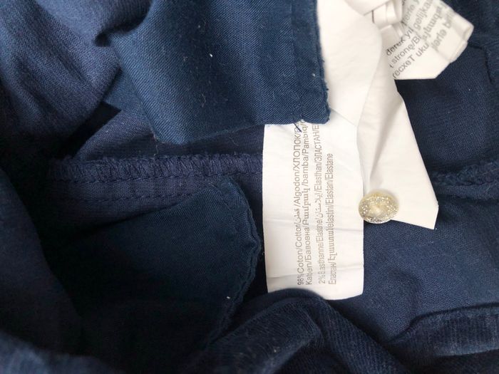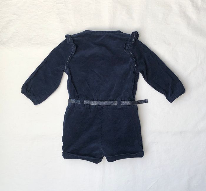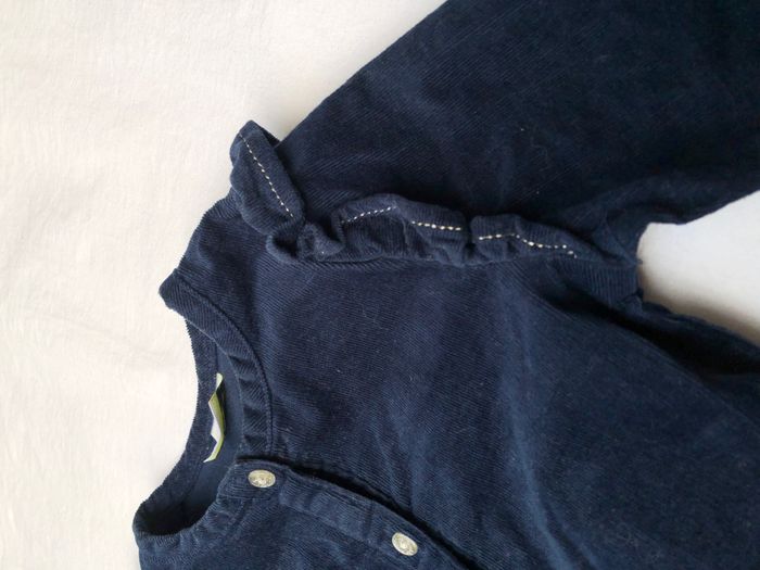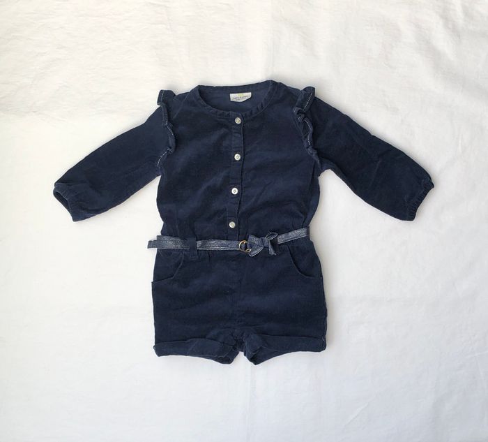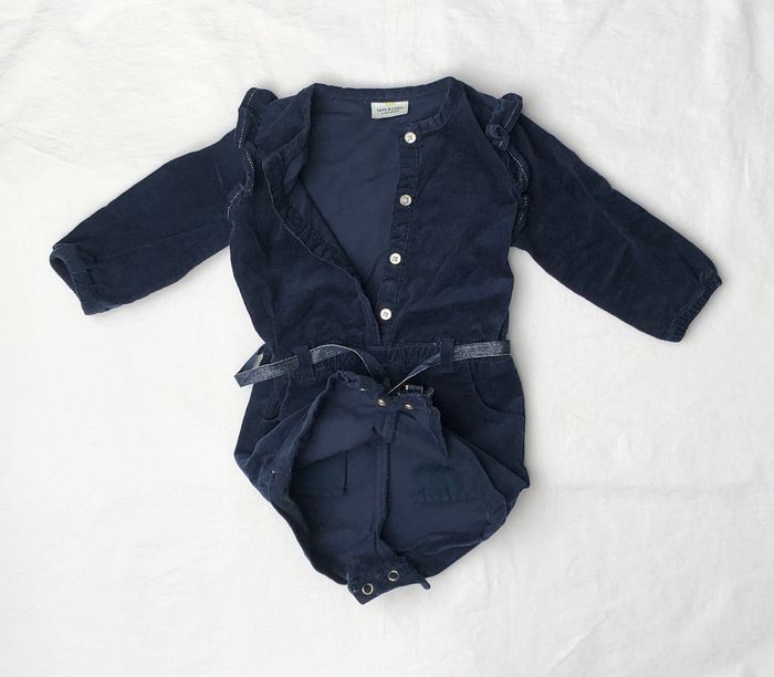 Combi courte Tape à l’œil, Taille 6 mois/ 68 cm, Hiver/ mi-saison, En coton/ élasthanne : légèrement extensible, Manches longues resserrées au bout. En velours finement côtelé bleu marine, Volants sur l’avant, les épaules et le dos, Ceinture ruban avec un petit nœud, amovible Ouverture sur l’avant avec de jolies boutons pailletés, et par pressions entre les jambes. En excellent état, sans trou ni tache. Non décolorée. Si besoin le bouton de secours est encore cousu sur l’étiquette. 🌸 Vous aimez cet article ? N’oubliez pas de visiter le reste de mon dressing en filtrant les tailles.