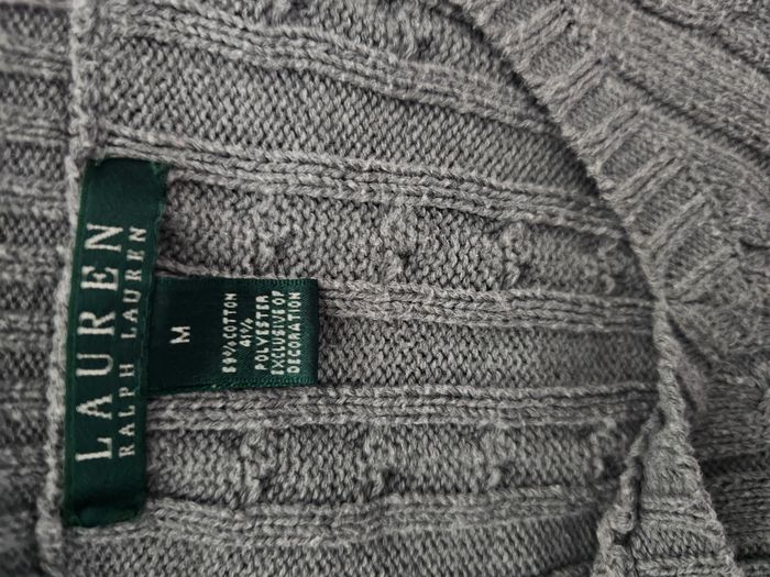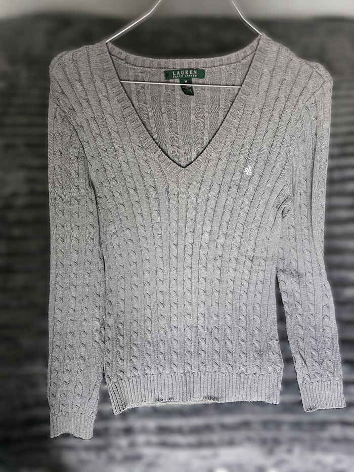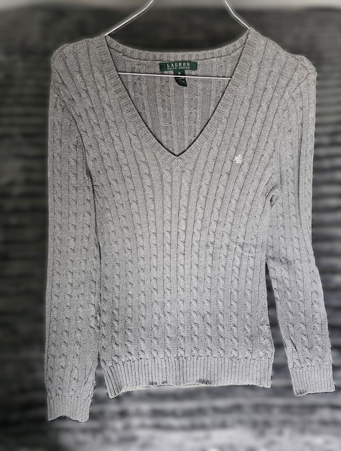 🧥 Pull en maille torsadée Lauren Ralph Lauren – Gris – Taille M – Femme Très joli pull Lauren Ralph Lauren en maille torsadée, coloris gris intemporel. Coupe élégante avec col en V, facile à porter au quotidien comme pour une tenue plus habillée. Maille douce et agréable, belle tenue. ✔️ Logo discret brodé sur la poitrine ✔️ Classique chic, indémodable