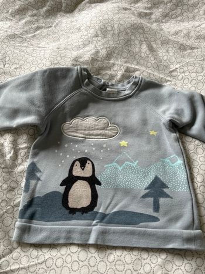Lot comprenant 1 pull motif pingouin H&M 1 pull beige et rayures marines Bout d’chou 1 gilet bleu marine in extenso