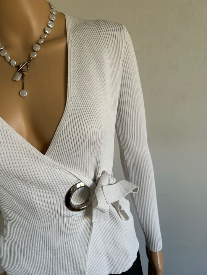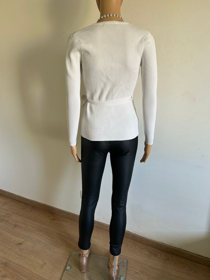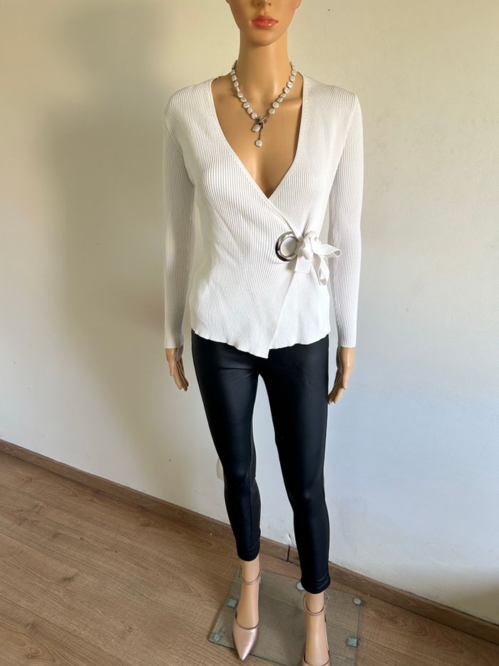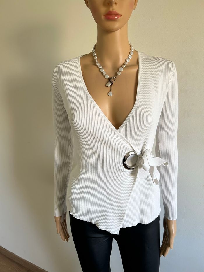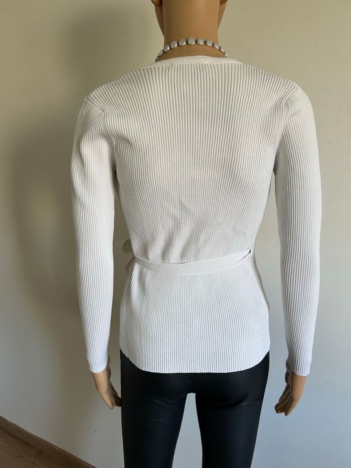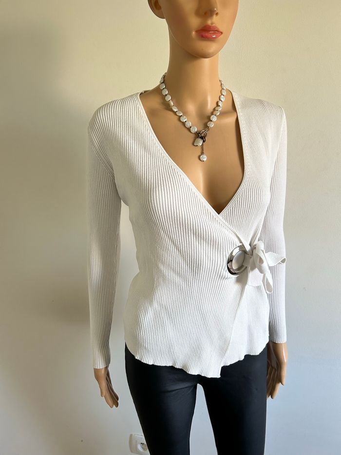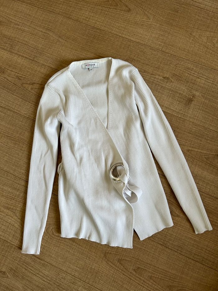 Joli pull portefeuille blanc à manches longues, de marque Morgan. Taille XS. Porté plusieurs fois, état satisfaisant : il est légèrement jauni au niveau du col (voir photo). aisselle à aisselle 35 cms à 44 cms épaule à épaule 32 cms à 37 cms longueur manches 54 cms taille 30 cms à 38 cms longueur depuis épaule 55 cms Le tissu est extensible Étiquette intérieure de composition coupée