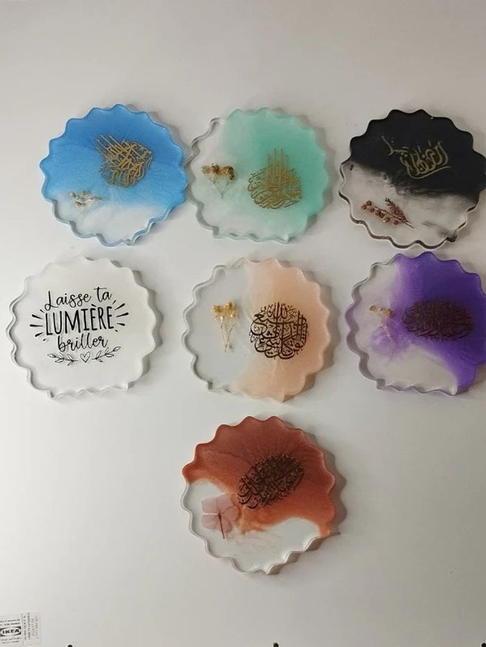 👇 Clic pour voir d'autres créations: #bouhlelnum4_FaitMain Matière: résine, stickers fleur imbriquée. 10x10x0,5 cm 75g N’hésitez pas à me contacter pour toute question ou pour vous aider à fouiller dans ma vitrine 😊