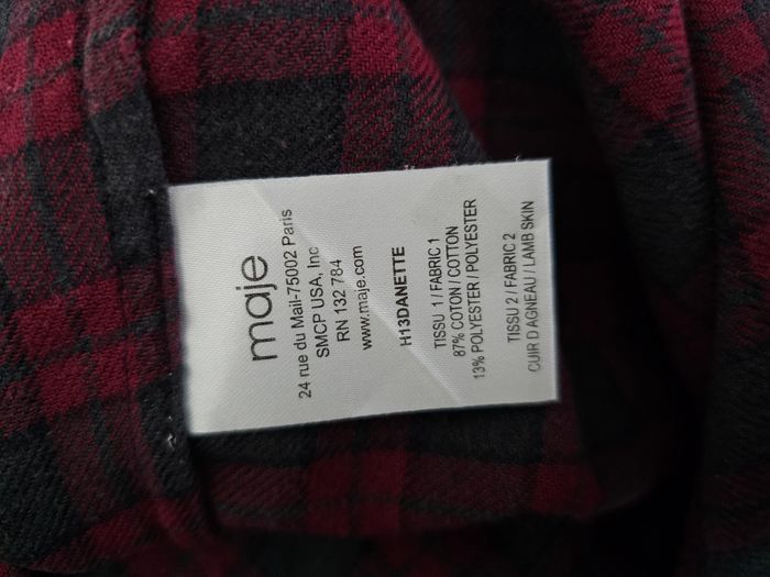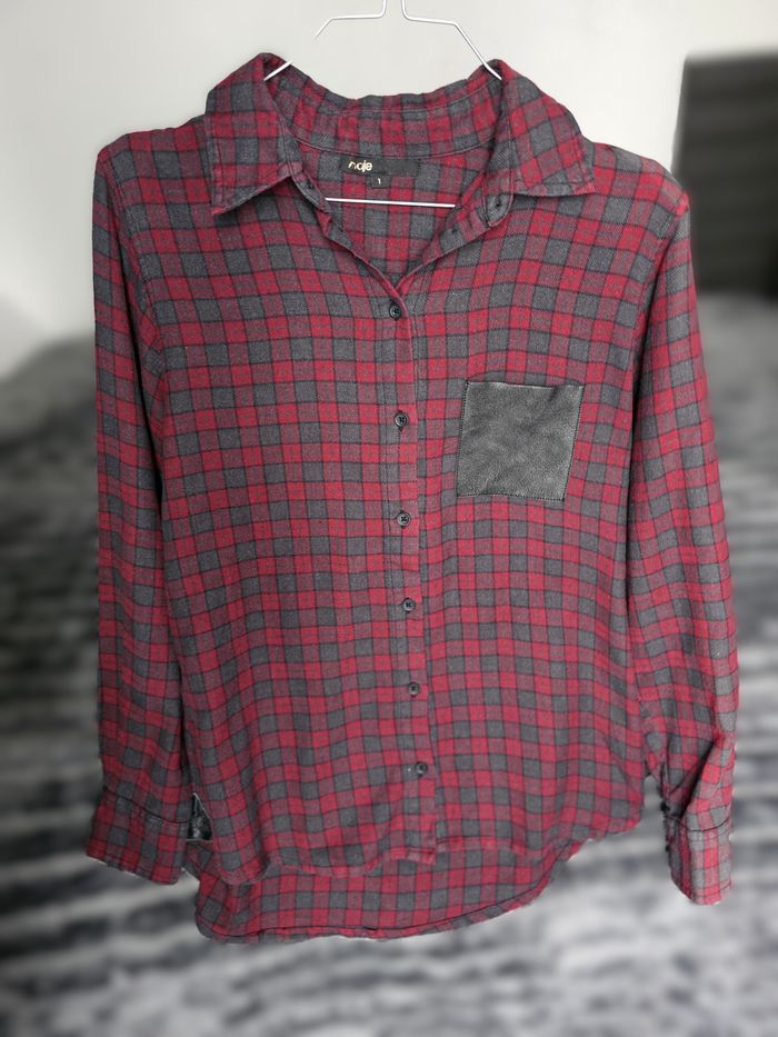 👚 Chemise à carreaux MAJE – Femme Chemise à carreaux rouges et gris de la marque Maje. Modèle élégant et casual à la fois, avec col classique, fermeture boutonnée et poche poitrine en cuir d’agneau, détail signature de la marque. Idéale pour un look chic-décontracté, seule ou portée ouverte sur un top. 👤 Pour femme 📏 Taille : 1 (équivalent S) Mesures à plat : - Aisselle à aisselle : 50 cm - Longueur (haut/bas) : 64 cm