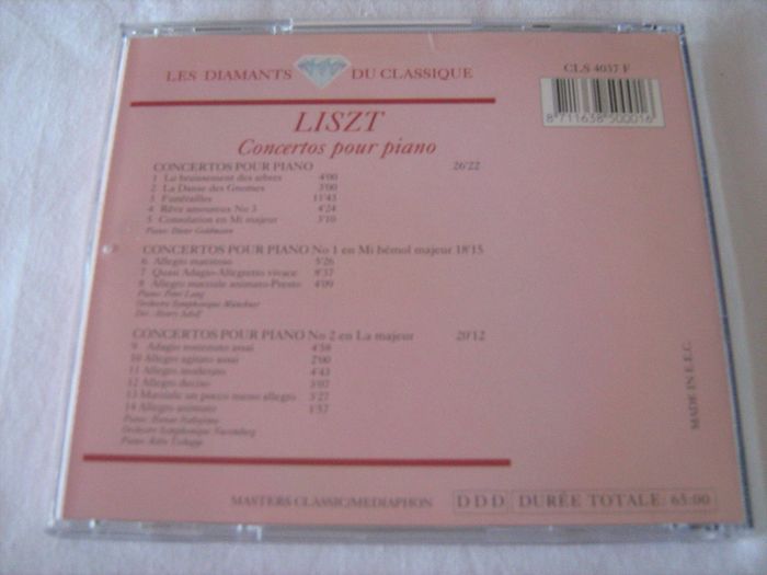 Vends CD Liszt - Concertos pour piano. CONCERTOS POUR PIANO : 1/ Le bruissement des arbres 2/ La Danse des Gnomes 3/ Funérailles 4/ Rêve amoureux n° 3 5/ Consolation en Mi majeur (Piano : Dieter Goldman) CONCERTOS POUR PIANO N° 1 en Mi bémol majeur 6/ Allegro maestoso 7/ Quasi Adagio-Allegretto-Vivace 8/ Allegro marziale animato-Presto (Piano : Peter Lang - Orchestre Symphonique Münchner - Dir. : Henry Adolf) 9/ Adagio sostenutto assai 10/ Allegro agitato assai 11/ Allegro moderato 12/ Allegro deciso 13/ Marziale un poco meno allegro 14/ Allegro animato (Piano : Hanae Nakajima - Orchestre Symphonique Nuremberg - Piano : Räto Tschupp) Pour plus de choix, allez voir mes autres annonces.4