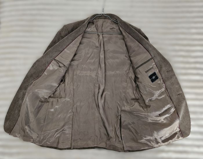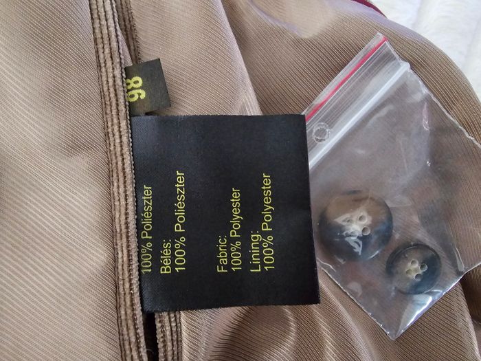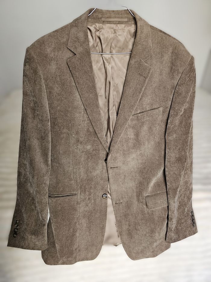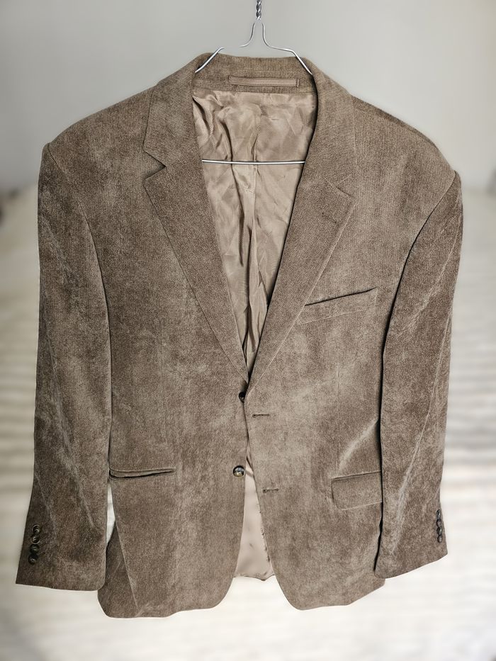 Veste / blazer marron homme – BRAGA Veste élégante de la marque BRAGA, idéale pour un look chic ou casual. Coupe droite structurée, coloris marron clair/taupe très facile à assortir. Entièrement doublée, agréable à porter. Tissu en polyester effet velours/côtelé fin, rendu qualitatif. Présence de boutons de rechange (voir photo). 👉 Pour homme 👉 Taille indiquée : 98 (correspond à un L environ – voir mesures) Mesures à plat : - Aisselle à aisselle : 57 cm - Longueur (haut/bas) : 82 cm
