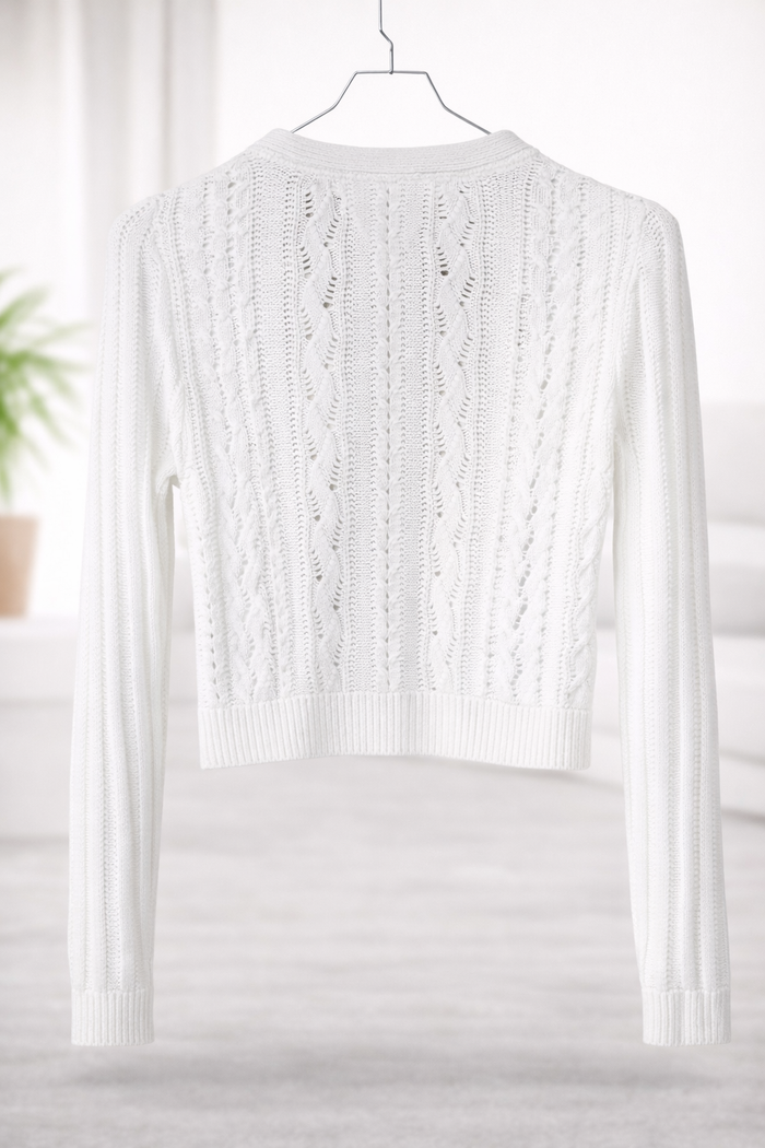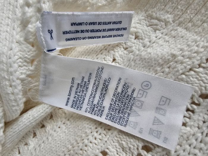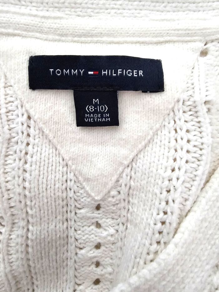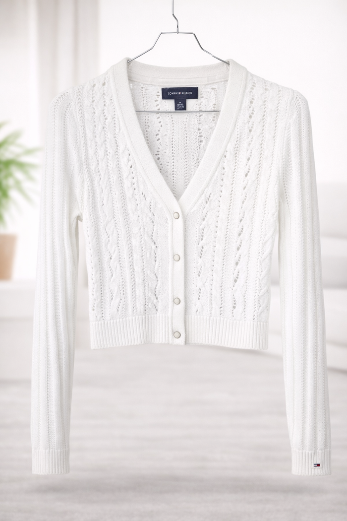 ✨ Cardigan court Tommy Hilfiger blanc – maille ajourée – Femme ✨ Superbe cardigan court Tommy Hilfiger, coloris blanc cassé, en maille ajourée élégante avec boutonnage sur le devant. Coupe féminine et ajustée : bien que noté taille M (8–10), il convient davantage à un XS (voir mesures). Idéal porté seul ou sur un top, parfait pour la mi-saison ou l’été 🌸 ✔️ Marque : Tommy Hilfiger ✔️ Taille indiquée : M (8–10) ➡️ Convient plutôt à : XS ✔️ Type : cardigan court ✔️ Convient pour : Femme ✔️ État : très bon état ✔️ Composition : 60 % coton, 40 % acrylique Mesures à plat : - Aisselle à aisselle : 44 cm - Longueur (haut / bas) : 44 cm