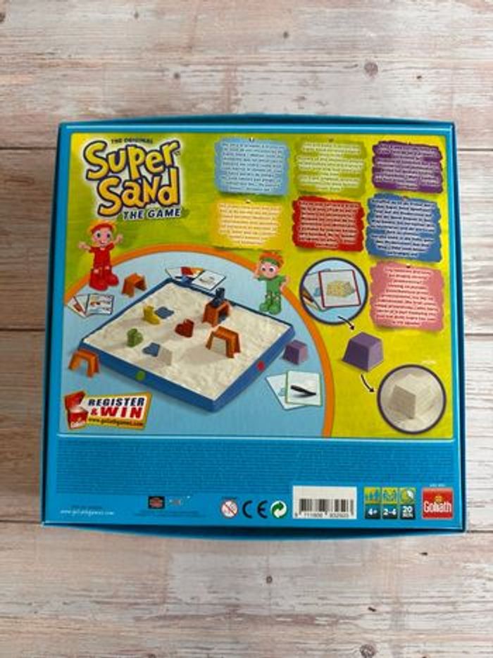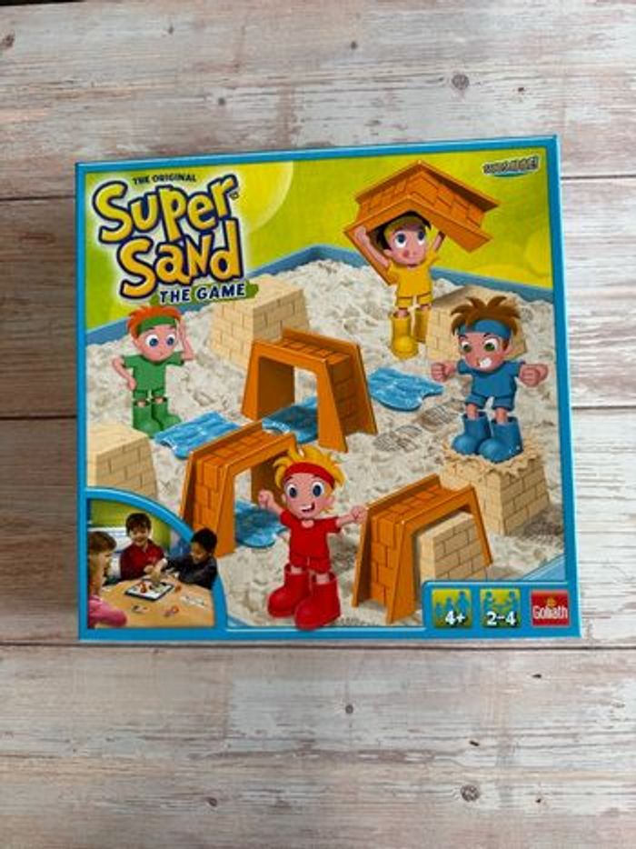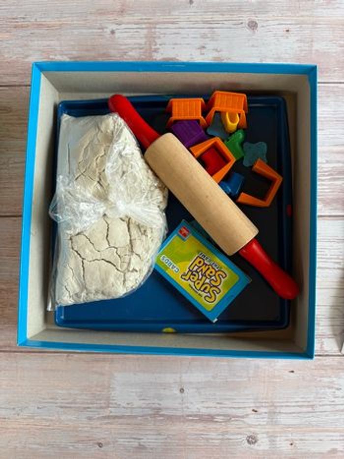 Jeux super sand ( sable magique) Boîte un peu vieilli par temps mais ne gêne en rien au jeu . Ne convient pas aux enfants de moins de 3 ans
