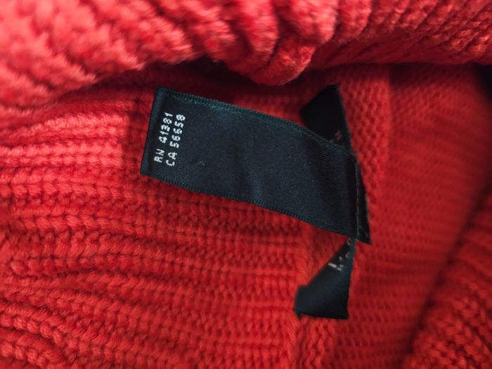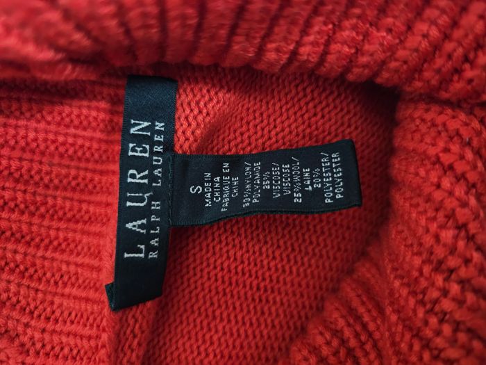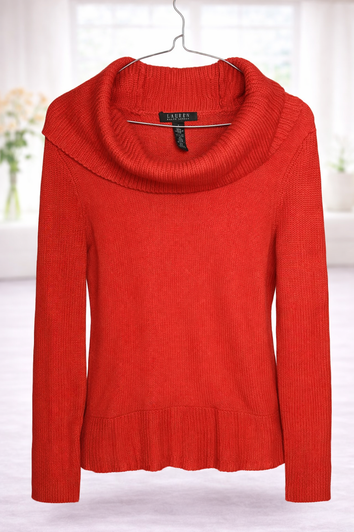 Pull col large LAUREN Ralph Lauren – rouge – taille S – Femme Très joli pull LAUREN Ralph Lauren, maille douce et confortable, coloris orange. Col large type col boule, élégant et féminin, idéal pour l’automne/hiver. Coupe ajustée, facile à porter avec un jean ou une jupe. Taille indiquée : S Convient pour femme Composition : 50% nylon / 25% viscose / 25% laine Dimension : - Largeur aisselle: 47 cm - Longueur (haut/bas): 64 cm