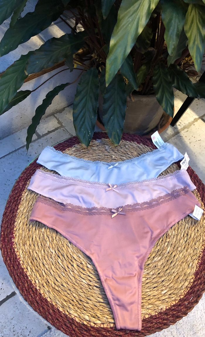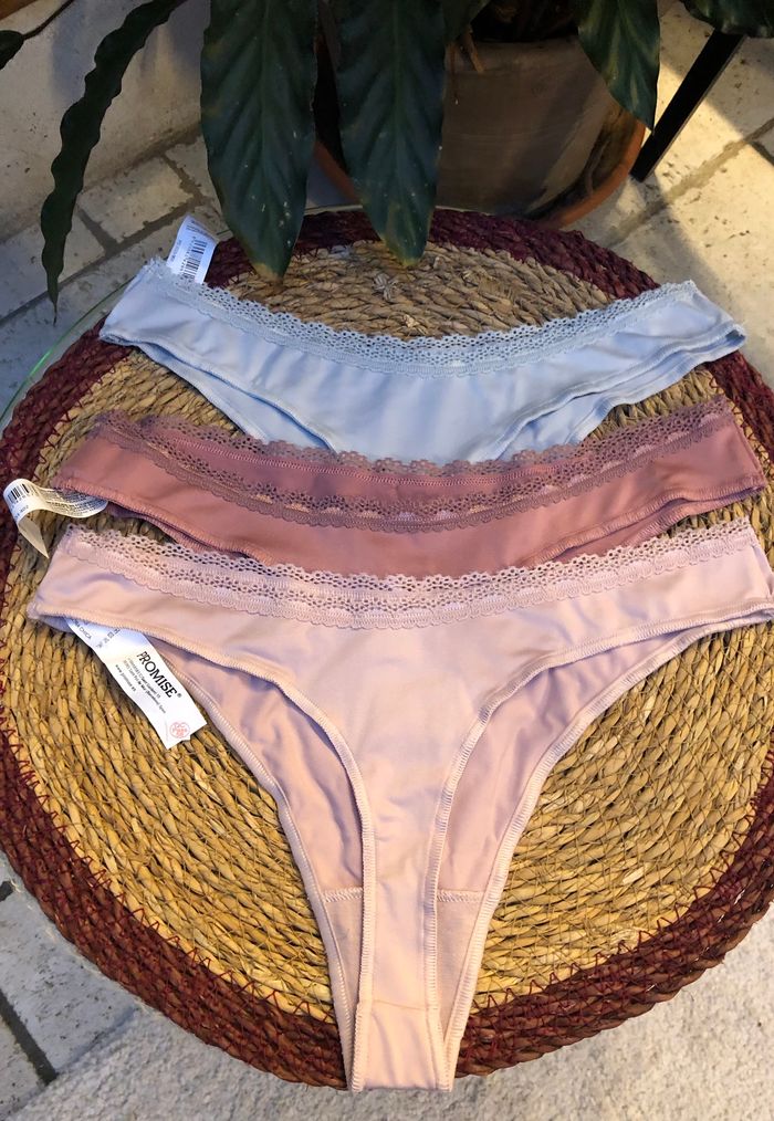 lot de 3 tangas ,vert,rose pâle,vieux rose ,taille S en microfibre ,super doux, très bien finis ,ils sont festonnés sur les bords.Excellente marque "Promise"