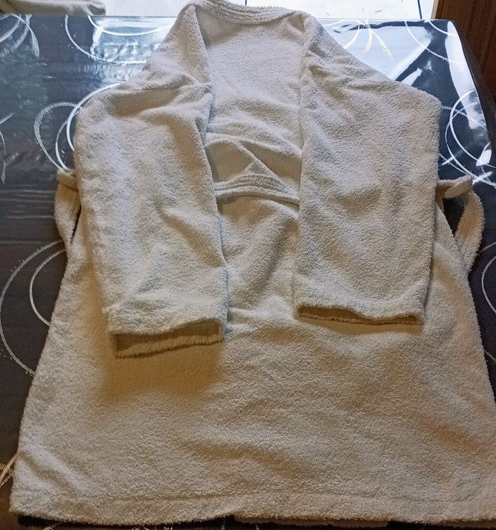 Peignoir enfant 100% coton blanc. Très confortable et agréable à porter après le bain ou à la piscine. Ceinture à nouer à la taille, deux poches à l’avant, matière absorbante, bon état général