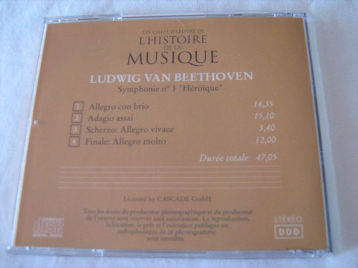 Vends CD Beethoven - Symphonie n° 3 "Héroïque" : 1/ Allegro 2/ Adagio essai 3/ Scherzo : Allegro vivace 4/ Finale : Allegro molto Pour plus de choix, allez voir mes autres annonces.