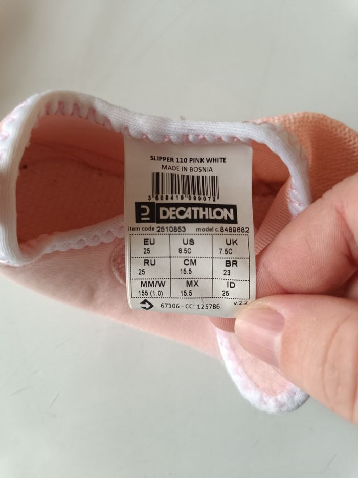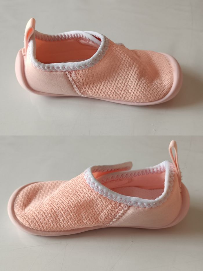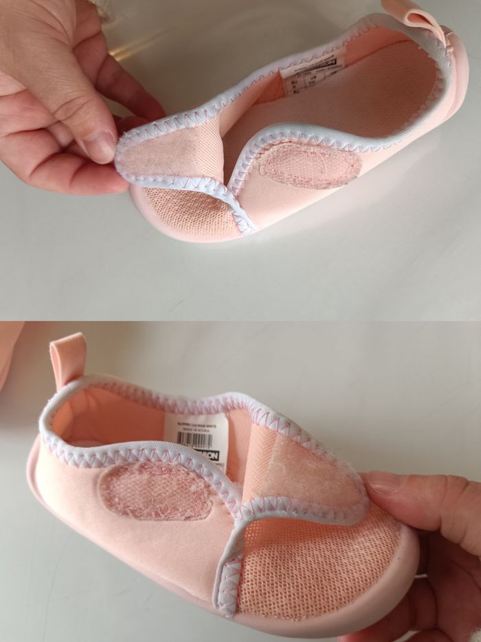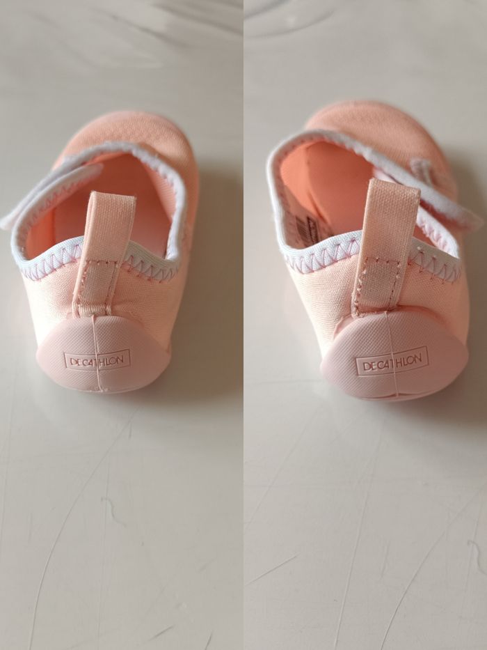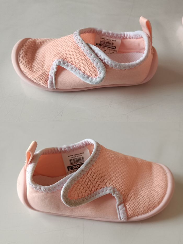 Chausson de baby gym. Idéal à l'école, à la crèche, à la maison... Couleur : Rose et blanc. Semelle souple et antidérapante. Attache scratch. Marque sur les semelles et dessous. Taille : 25. #melody45340accessoireenfant