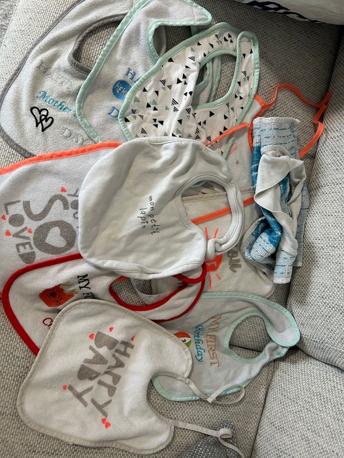 11 bavoirs a scratch et ficelles quelques uns on déjà été utilisé et d’autres sont neufs