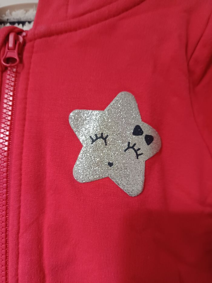 Gilet rose motif étoile argentée, Molletonné à l'intérieur donc bien chaud, Avec capuche. NEUF jamais porté ! Taille 12 mois