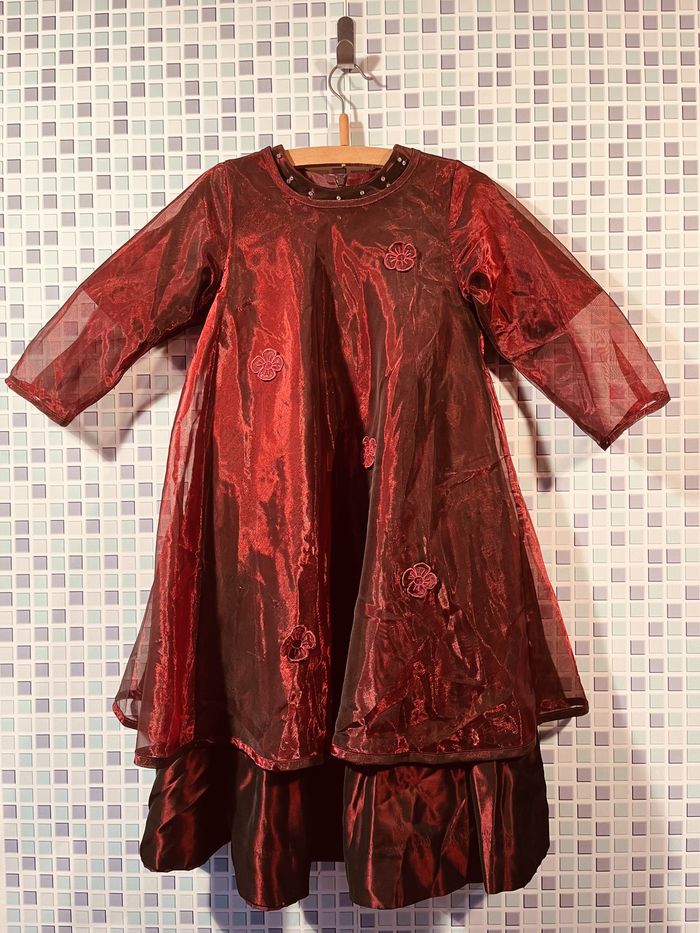 Sublime robe de cérémonie de la maison Jacadi. Jupon doublé pour un joli mouvement. Manches courtes. Brodée de perles transparentes au niveau du col et des manches. Fermée par une fermeture Eclair et un adorable lacet au dos. A porter avec ou sans son voile à manches longues, patché de petites fleurs à l'avant et fermé par 4 petites boutons au dos. Effet satiné sur toute la robe et son voile. Une véritable pépite, idéale pour habiller une petite fille pour une cérémonie, un récital de musique, un réveillon...