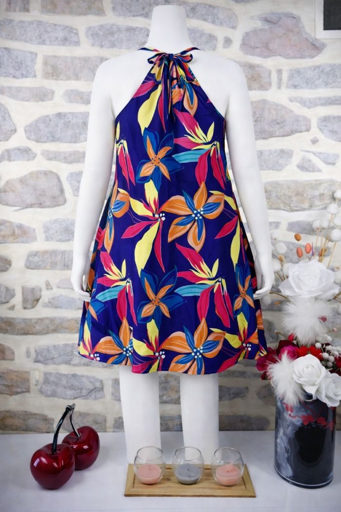 Robe douce brise tropicale exotique Femme taille 52 marque Asos ✴️ Coupe droite et évasée ✴️ Col halter ✴️ Robe à fond bleu marine profond, sur lequel s'épanouissent de grands motifs floraux et feuilles dans des teintes éclatantes et dynamiques : des roses fuchsia, des oranges vifs, des bleus turquoise et clairs, ainsi que des touches de jaune pâle/vert anis ✴️ Composition => 100 % polyester ✴️ Longueur -> 95 centimètres ✴️ Tour de poitrine => 126 centimètres ✴️ Tour de hanches => 134 centimètres