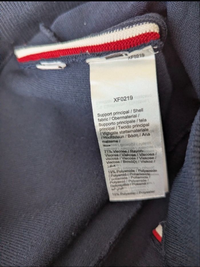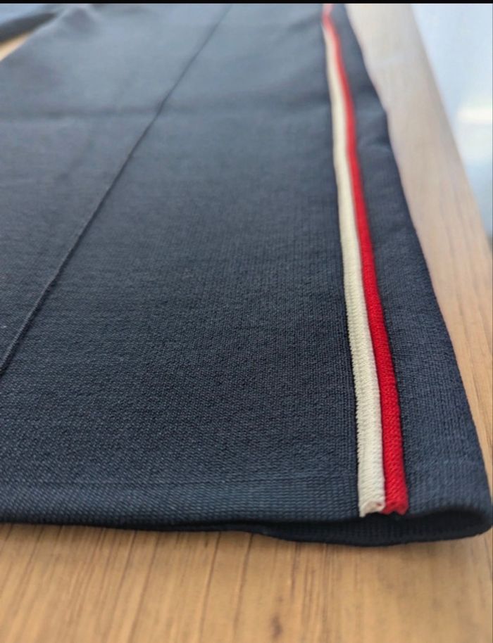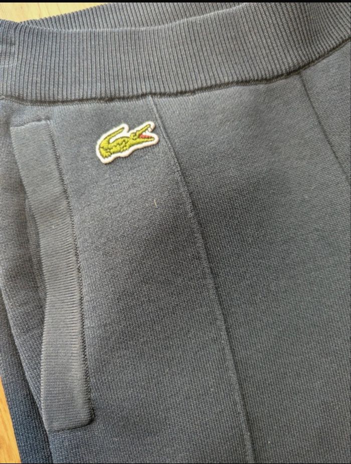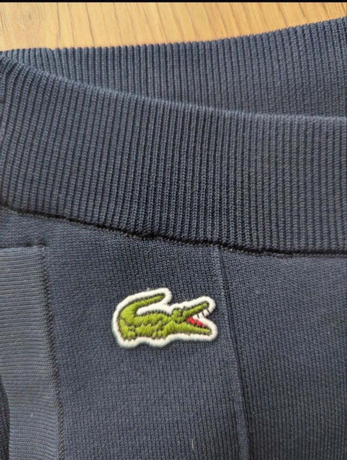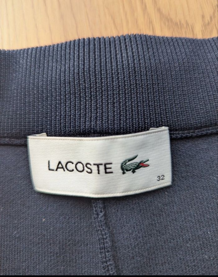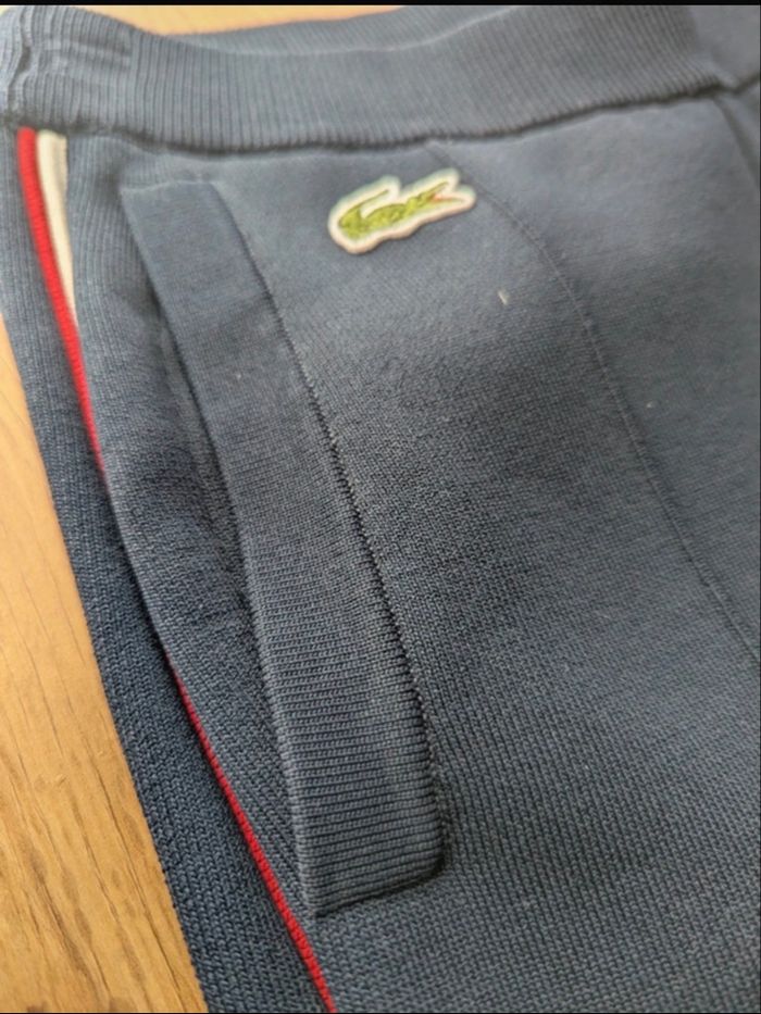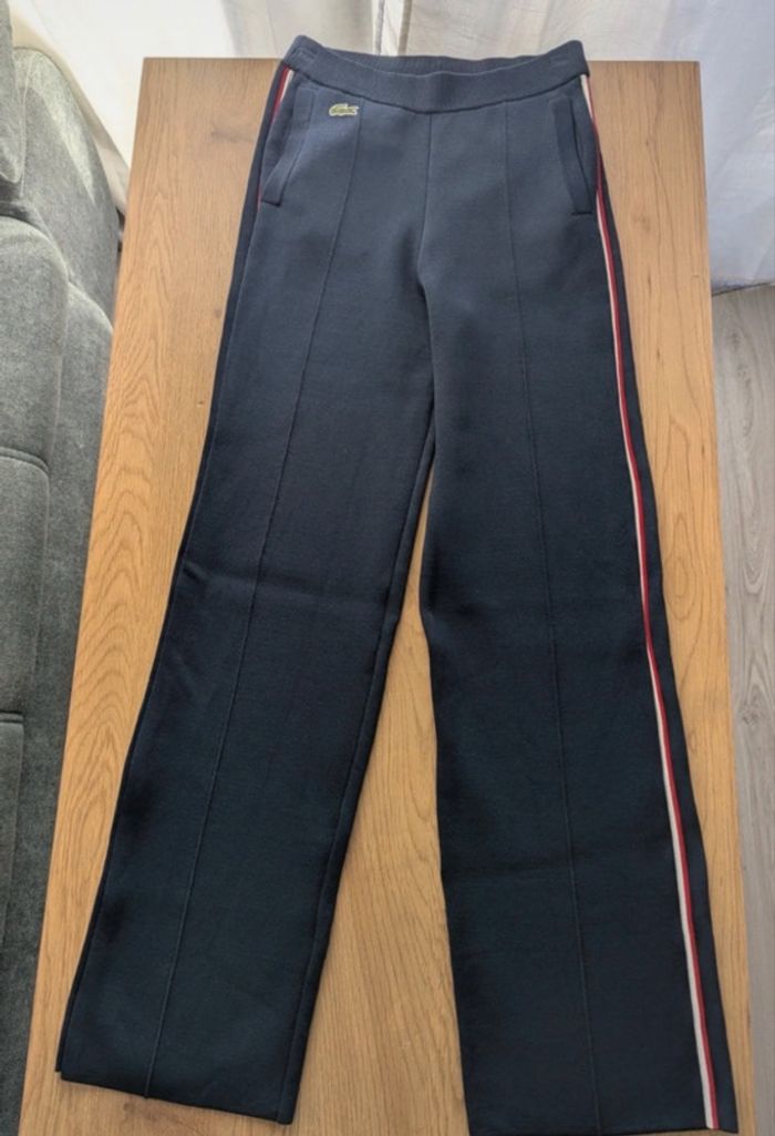 Pantalon matière jogging couleur marine , avec liserer rouge et blanc sur les côtés, taille 32 , 71% viscose, 19 % polyamide , dimension taille 33 cm , longueur totale 103 cm , largeur cheville 22 cm , #pantalon #lacoste