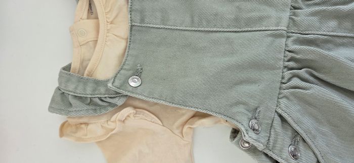 Ensemble robe salopette vert pâle style denim avec bretelles fines et pressions T-shirt beige- crème avec inscription ma maman d'amour 12 mois 74 cm Vertbaudet Très bon état
