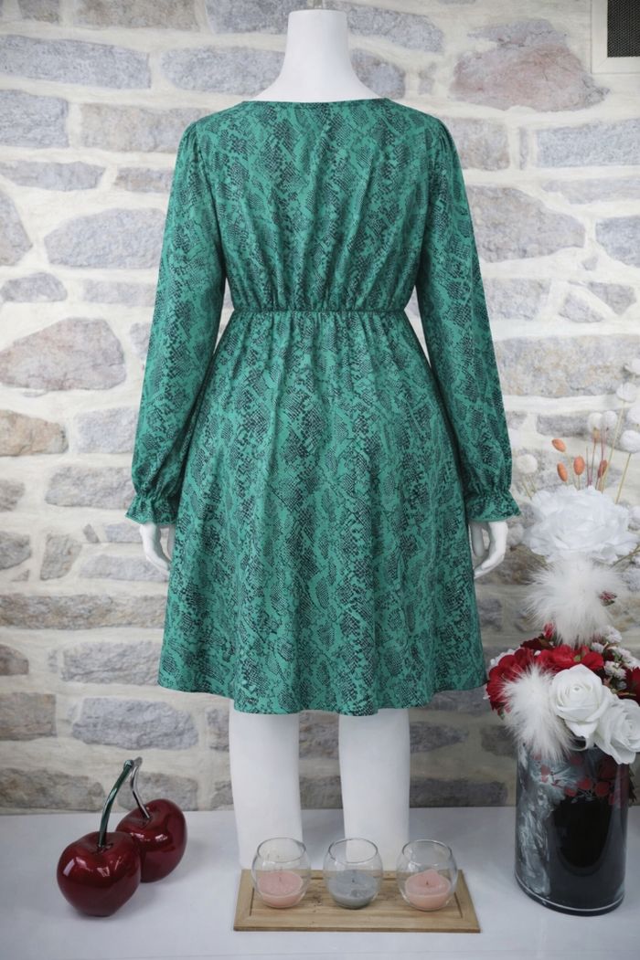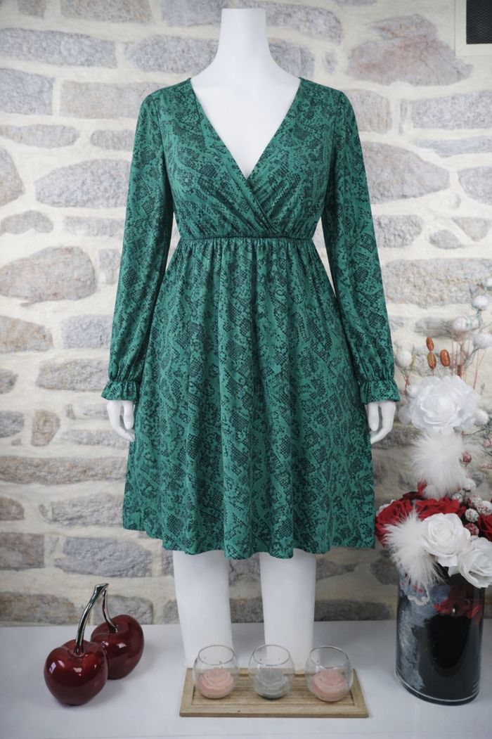 Robe sauvage serpent d émeraude vert canard noire et grise Femme taille 54 marque Boohoo ✴️ Décolleté cache-cœur ✴️ Taille froncée ✴️ Manches longues ✴️ Poignets froncés ✴️ Coupe fluide arborant un imprimé serpent stylisé dans une magnifique palette de couleurs. Les nuances de vleu canard et des touches de noir et de gris foncé créent un motif captivant et très tendance ✴️ Composition => 100 % polyester ✴️ Longueur => 104 centimètres ✴️ Mesure épaules à épaules => 42 centimètres ✴️ Tour de poitrine => 130 centimètres