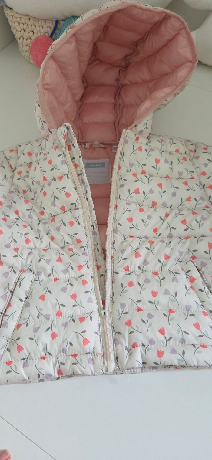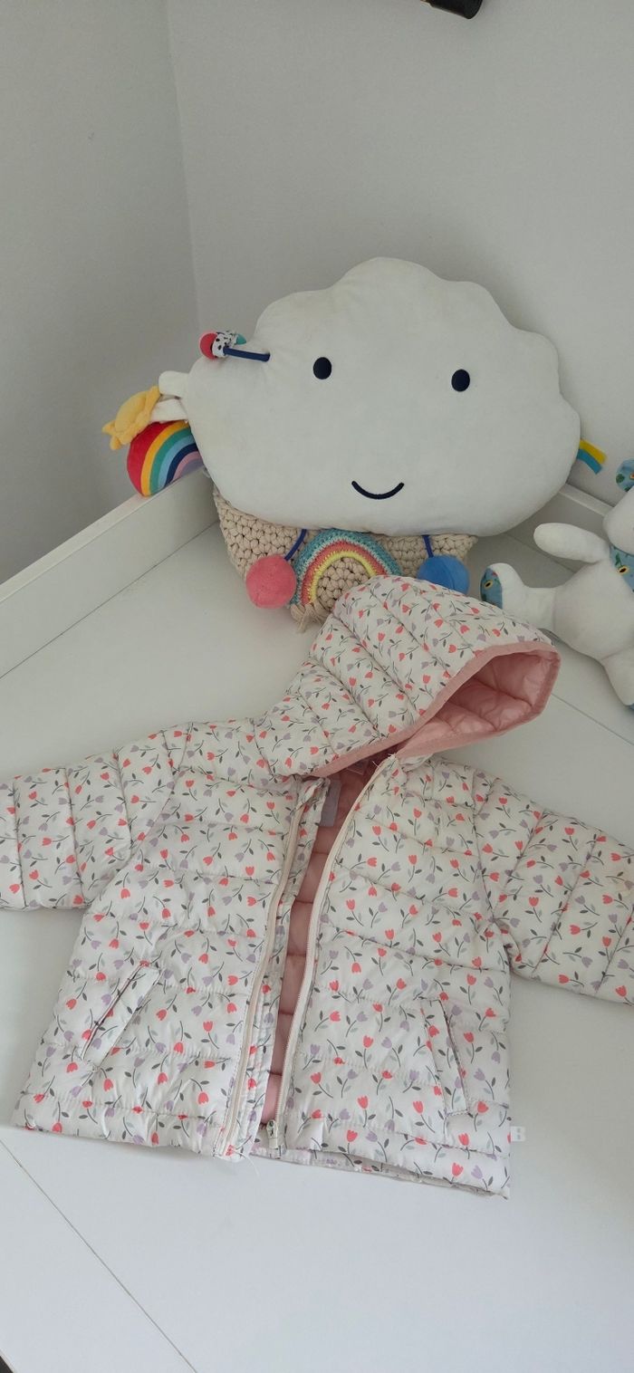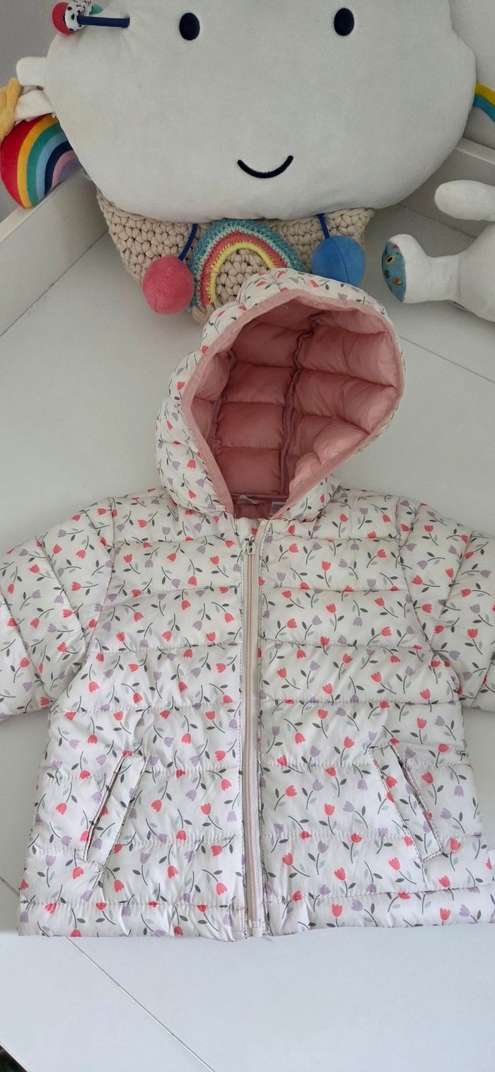 Doudoune blanche à fleurs roses et violettes Obaïbi 12 mois Très bon état sans tâches ni trous La fermeture éclair à un défaut (petit attache du fermoir cassée) mais elle ferme toujours très bien (je peux envoyer une vidéo si besoin)