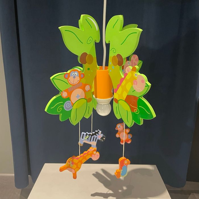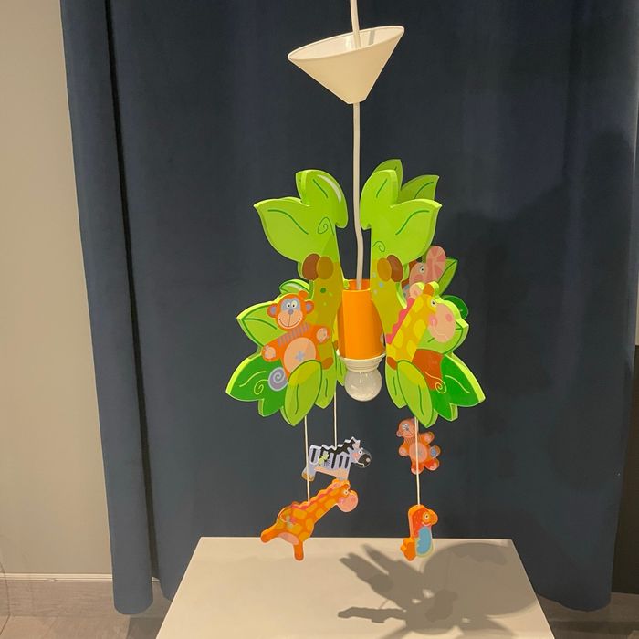 Lustre pour chambre d’enfant sur le thème de la savane, avec décorations d’animaux. Couleur principale : vert. Idéal pour apporter une touche ludique et colorée à une chambre d’enfant ou de bébé. Très bon état.