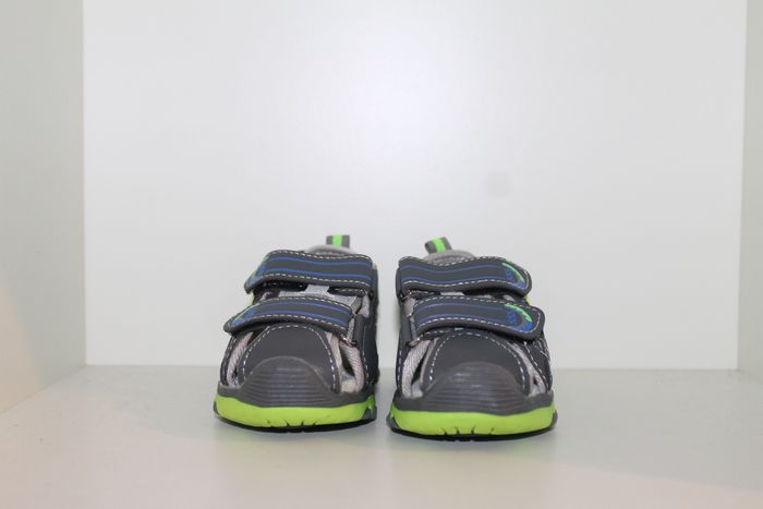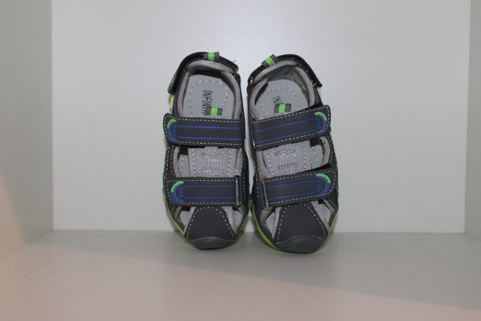 sandales nus pieds grise et verte pointure 30 neuves dans boites,model avec 3 velcros pour un serrage au plus juste et fermer au bout pour éviter que les doigts de pieds de dépassent.dimensions semelle intérieur 18 cm en mesurant au milieu de la semelle devant et derrière. marque infiniti shoes réf 0635 n'hésitez pas à faire un lot.