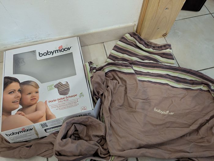Écharpe de portage avec boîte et notice Quelques petits trous sur le devant (ne gênent en rien l'utilisation) Possibilité d'avoir d'autres photos si besoin
