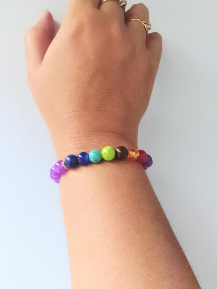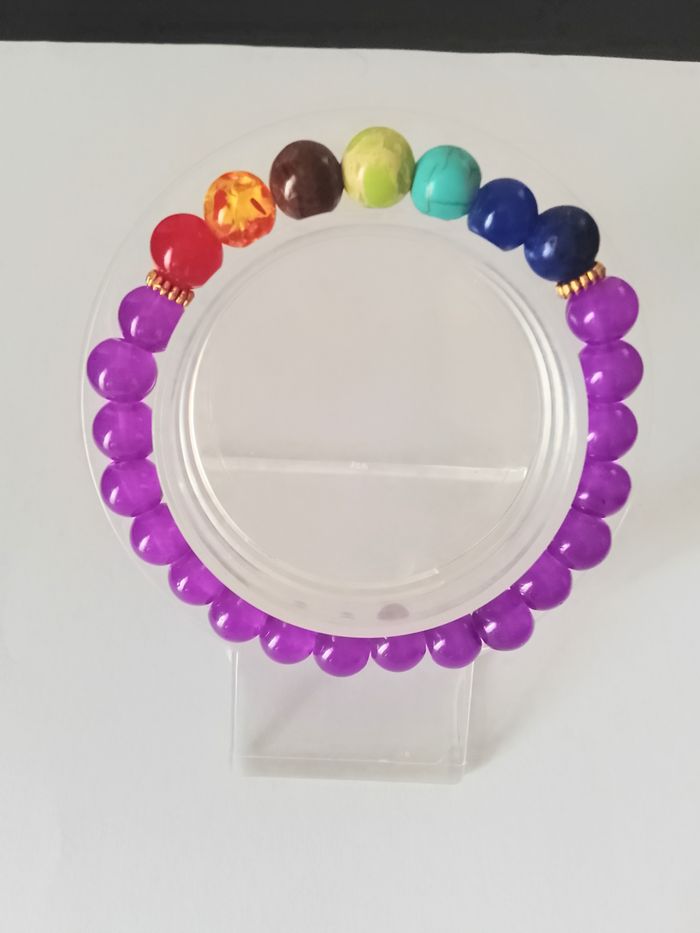 Bracelet 7 chakras (protection, spirituel, bohème, idéal cadeau) DESCRIPTIF : Couleur : multicolore, violet. Tour de poignet : 17 cm. Taille de la pierre : 8 mm. Envoi rapide et soigné.