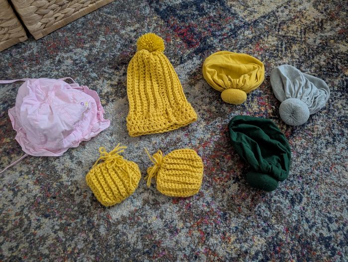 1 bonnet+ chaussons en laine jaune 3 petits bonnets fins vert, jaune et gris Un chapeau rose fin Pour petites têtes Possibilité d'avoir d'autres photos si besoin