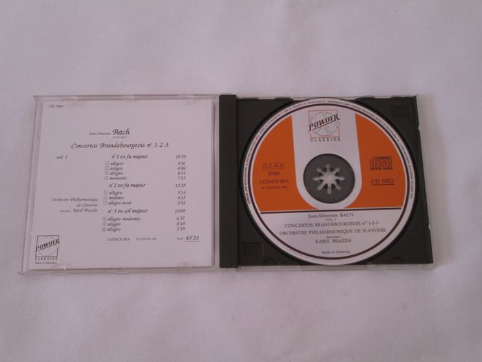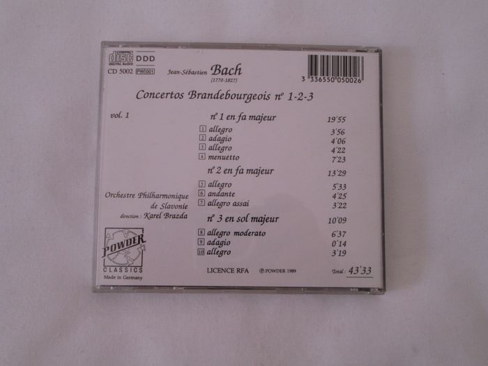 Vends CD Bach - Concertos Brandebourgeois n° 1 - 2 - 3. Concerto n° 1 en fa majeur : 1 / Allegro 2 / Adagio 3 / Allegro 4 / Menuetto Concerto n° 2 en fa majeur : 5 / Allegro 6 / Andante 7 / Allegro assai Concerto n° 3 en sol majeur : 8 / Allegro moderato 9 / Adagio 10/ Adagio Pour plus de choix, allez voir mes autres annonces.