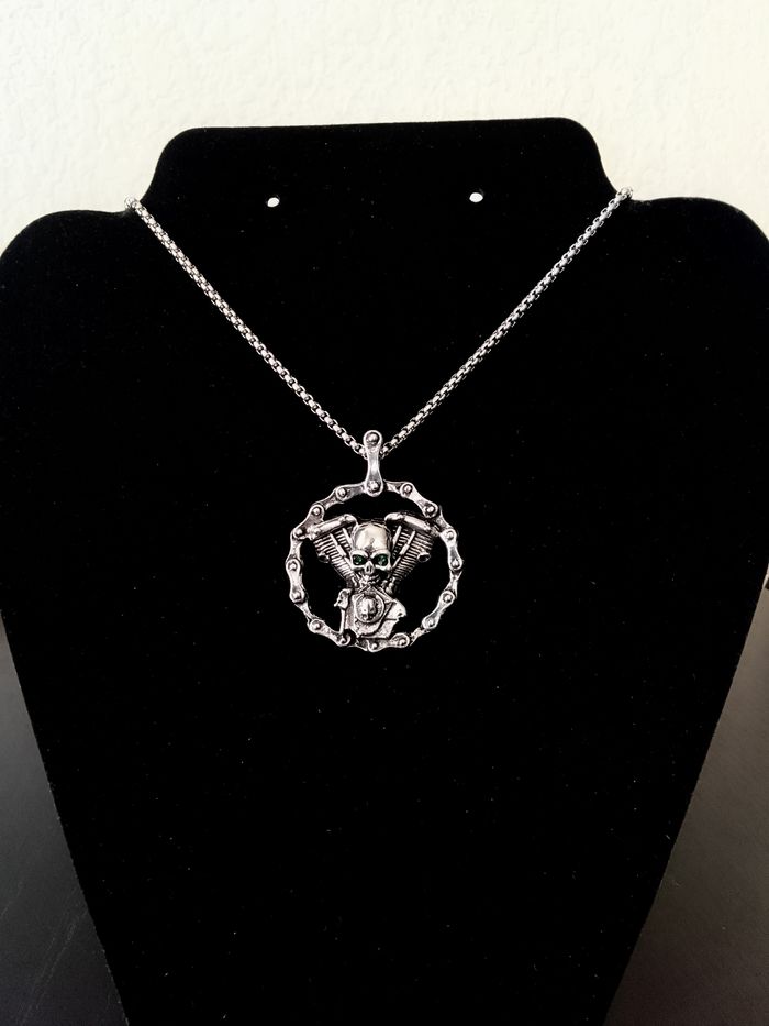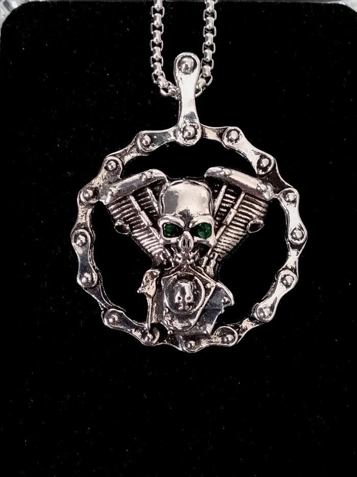 Chaîne + pendentif skull. Pendentif : roue, moteur moto, tête de mort. (gothique, celtique, punk, idéal cadeau) DESCRIPTIF : Couleur : argenté, vert. Taille chaîne : 60 cm Diamètre pendentif : 4 cm L * 4 cm H Envoi rapide et soigné.