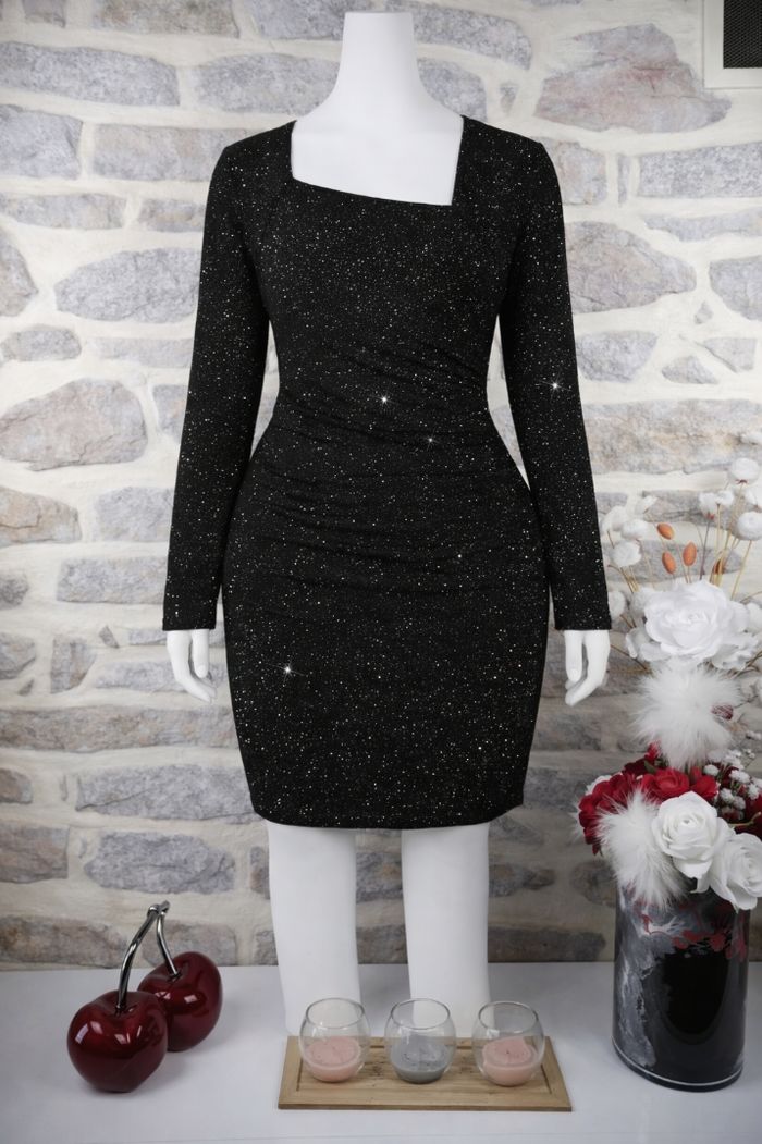 Robe de soirée scintillante éclat nocturne noire pailletée Femme taille 54 marque Asos ✴️ Encolure carrée ✴️ Manches longues ✴️ Drapé froncé sur le côté ✴️ Tissu scintillant pailleté ✴️ Couleur => Noir intense ✴️ Composition => 76 % polyamide 17 % elastanne 7 % fibres métallisées ✴️ Longueur => 100 centimètres ✴️ Mesure épaules à épaules => 45 centimètres ✴️ Tour de poitrine => 118 centimètres