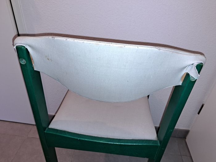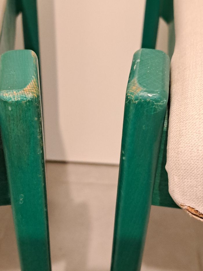Chaises en bois. Les usures sont dû au temps, la peinture est partie sur certains endroits.
