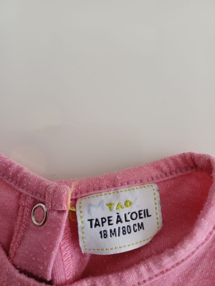 Très joli Tee-shirt de couleur rose et blanc en très bon état. La marque est TAPE À L'ŒIL et la taille 18 mois. Il s'attache avec deux pressions dans le dos au niveau du coup voir la photo ci jointe.