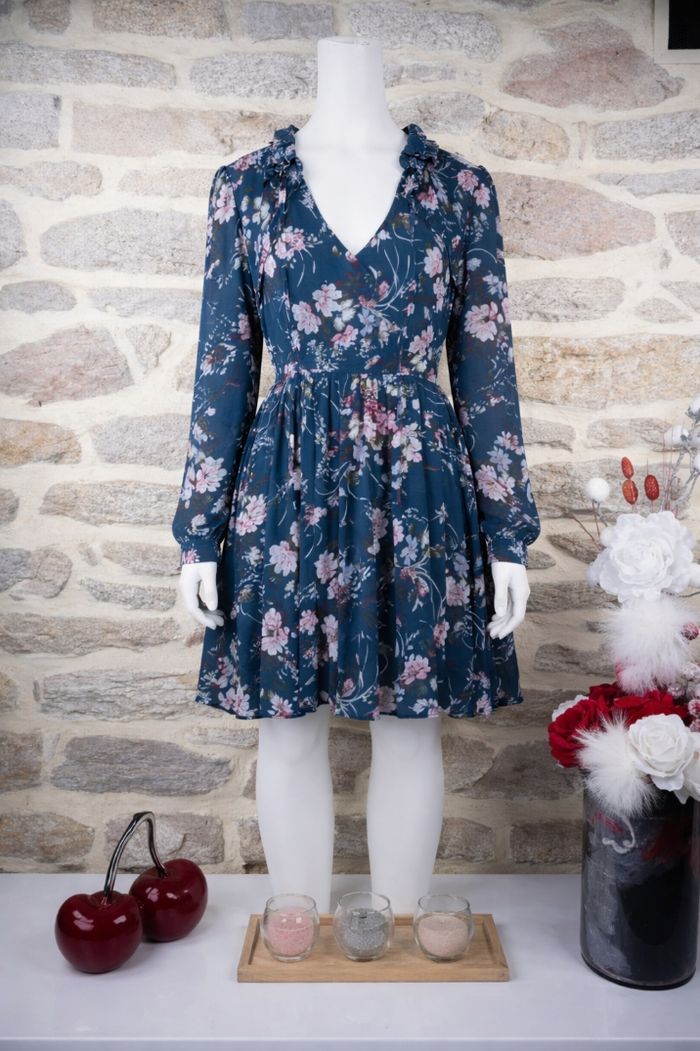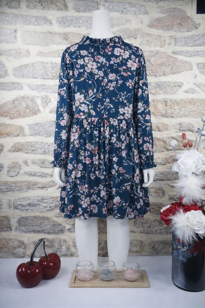 Robe oasis de poésie bleue sarcelle et rosé Femme taille 54 marque Boohoo ✴️ Décolleté en V ajustable par un lien ✴️ Col haut montant à volants ✴️ Manches longues ✴️ Coupe patineuse style babydoll sublimé par un imprimé floral délicat et raffiné. Les fleurs sont principalement dans des tons de rose poudré et clair, avec des touches de blanc cassé et de feuillage vert/marron sur un fond bleu sarcelle ✴️ Composition => 100 % polyester ✴️ Longueur => 96 centimètres ✴️ Mesure épaules à épaules => 52 centimètres ✴️ Tour de poitrine => 128 centimètres