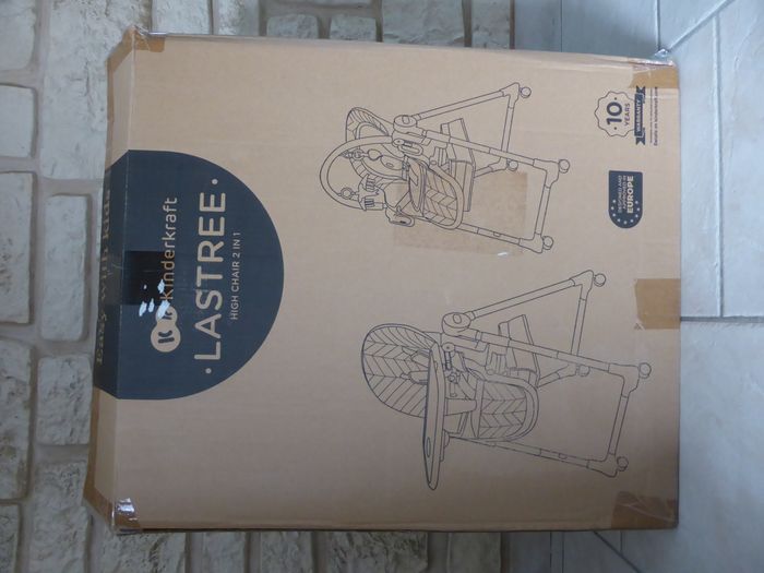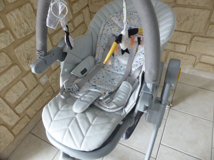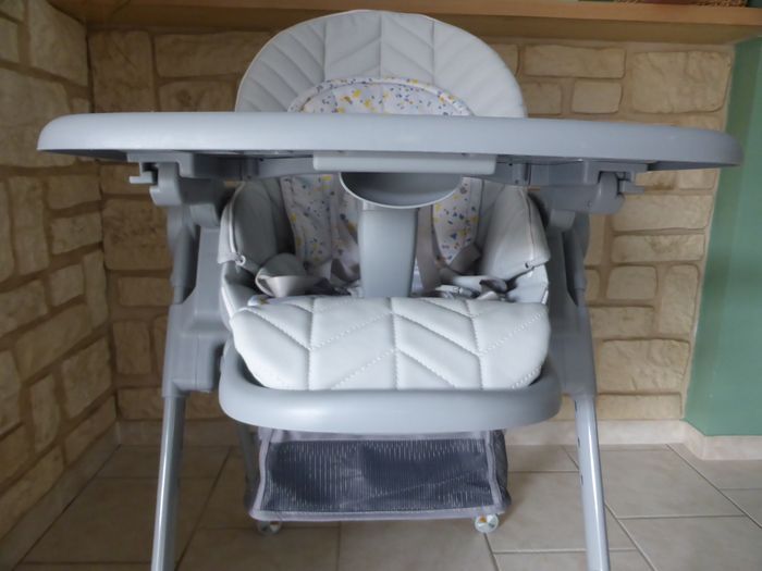 Chaise haute Lastree Kinderfraft. Couleur grise. Chaise haute 2-en-1 multifonction et évolutive passant de transat à chaise haute (voir la fin de l’annonce pour le descriptif technique). En parfait état d’utilisation. Tous les accessoires d’origine + le livret d’utilisation + l’emballage d’origine sont inclus. Très bon état mais petits défauts d’usage dont 1 accroc sur le haut de la housse + 1 rayure sur le bas d’un pied. Les roues ont été nettoyés mais traces persistantes. Voir photos pour plus de détails visuels. Valeur neuf : 140 €. Description technique : •Dossier réglable en 3 positions : allongé, semi-incliné, droit •Hauteur du siège réglable sur 5 niveaux •Repose-pieds réglable sur 3 positions •Plateau amovible et réglable sur 3 positions de profondeur, facile à enlever pour le nettoyage •Harnais de sécurité à 5 points et réglable •Arche de jeu / jouets suspendus pour stimuler le bébé quand il est en position transat •Pliage compact •4 roulettes silencieuses et verrouillables •Un panier sous l’assise pour les petits objets (bavoir, lingettes, etc.) et une pochette à l’arrière du dossier. •Housse en simili-cuir (cuir écologique) qui se nettoie facilement d’un coup d’éponge. Insert doux réversible pour plus de confort