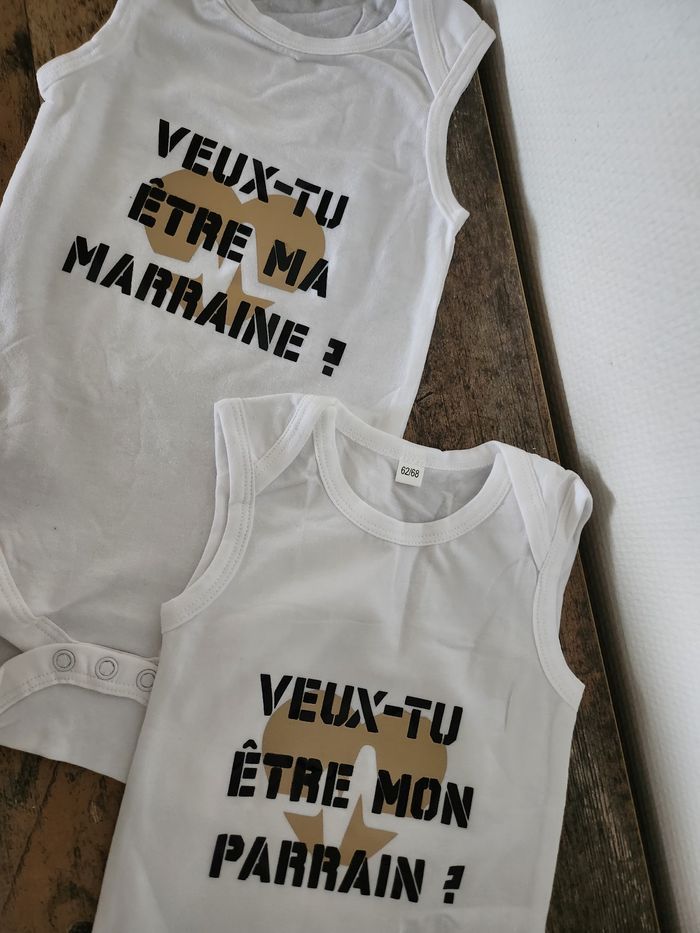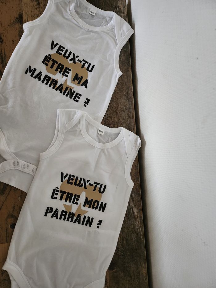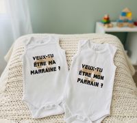 Je vous propose ce superbe ensemble de deux bodies pour faire une demande inoubliable au futur parrain et à la future marraine ! Un design moderne et élégant pour un moment riche en émotions.