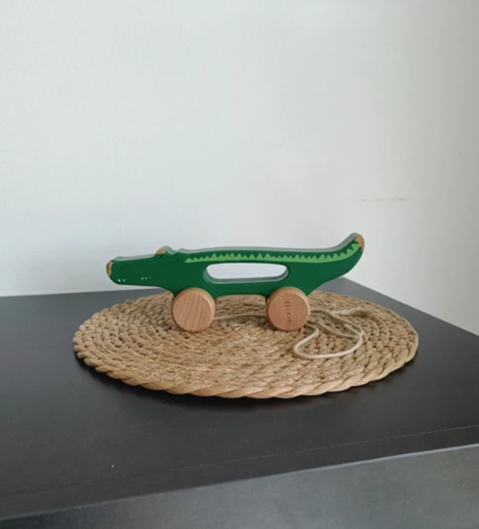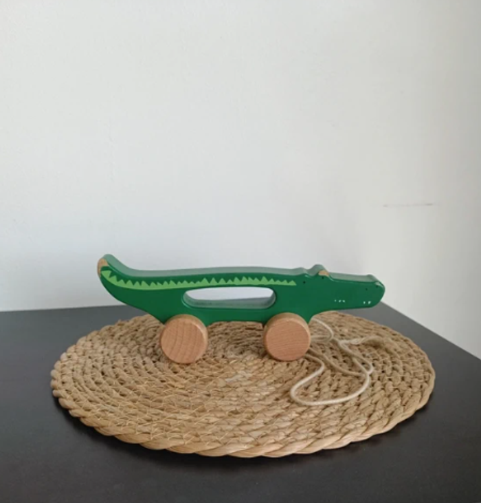 Découvrez le jouet à tirer en bois Mr. Crocodile de la marque Trixie. Il est composé d'une ficelle, d'une structure en bois en forme d'animal et de 4 roues. Ce jouet d'éveil occupera votre enfant durant de longues heures. Il permet de développer la coordination motrice et les sens de votre tout-petit. Valeur neuve : 14,90€ En bon état