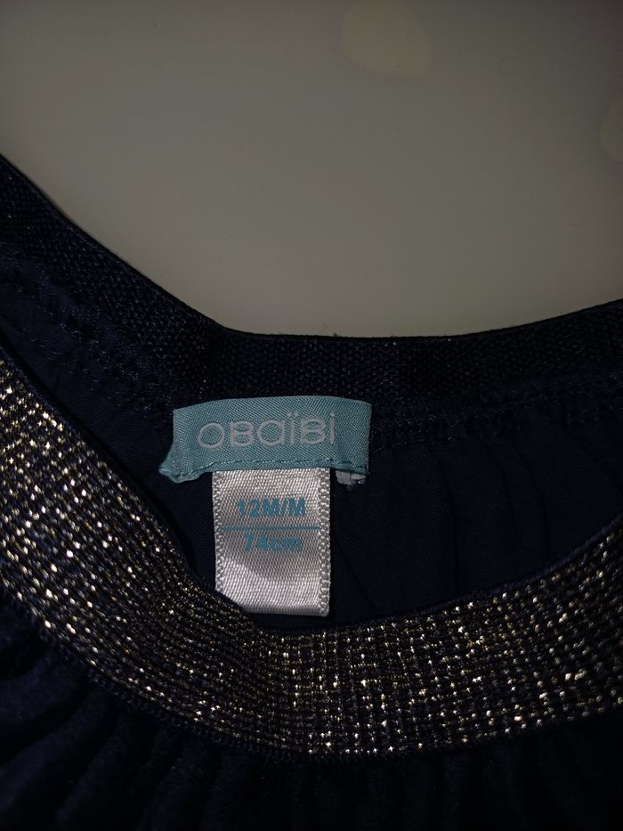 Très jolie jupe de la couleur bleu marine et gris pailleté. En très bon état et marque est OBAIBI et la taille 12 mois. Avec son jupon et très chaude.