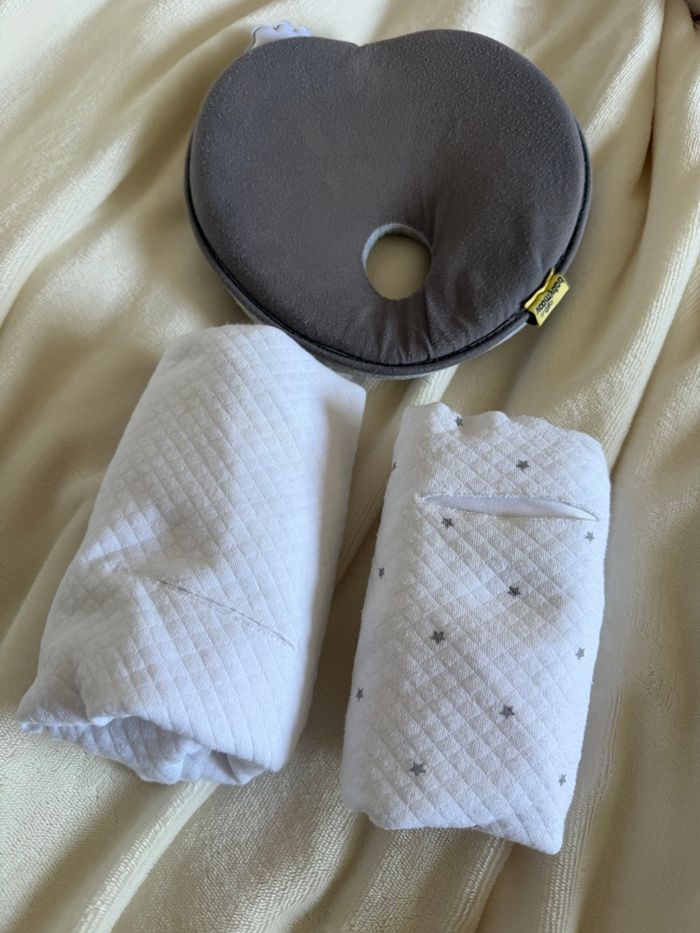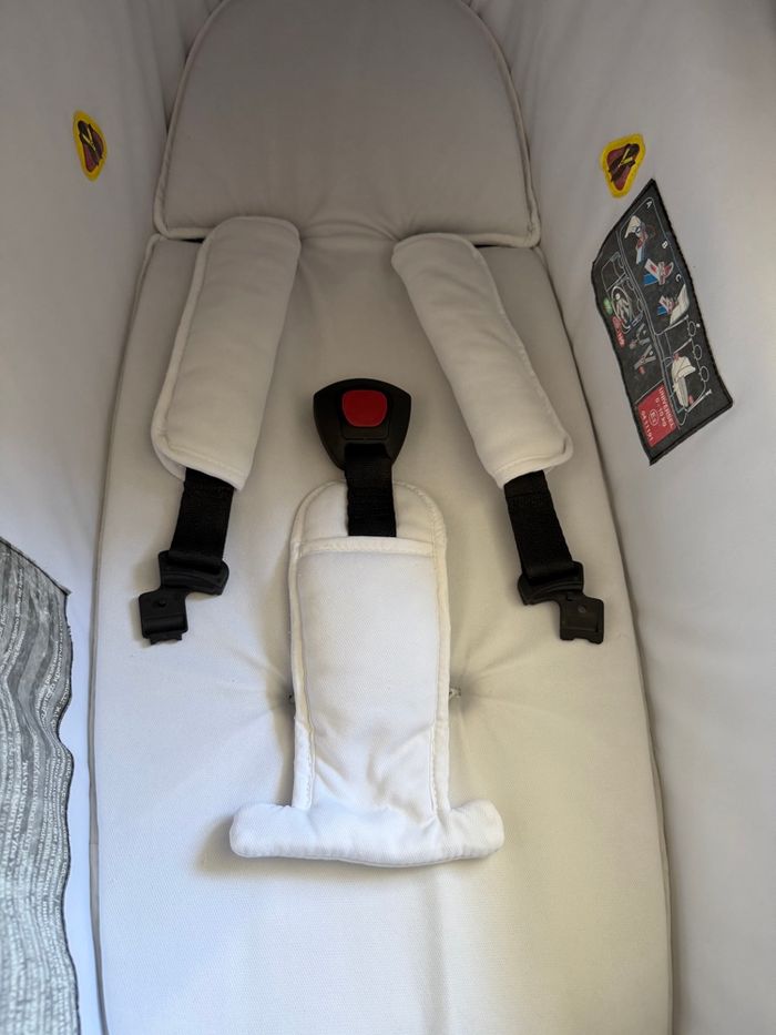 Nacelle complète de chez Bébé Confort. Bâche pluie d'origine. 2 draps housse de chez VERTBAUDET adaptable pour les sangles de sécurité. Coussin spécial pour la tête de bébé de chez Babymoove. Capot repris par une couturière aux niveaux des branches (visible sur les photos).