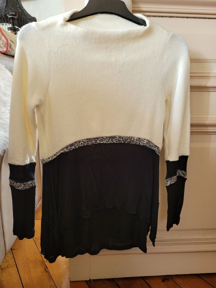 Tunique blanche et lainage très doux pour le haut, bas superposition de petits volants noirs. Taille S marque ( la mode est à vous) très bon état. FAIT partie du lot autre Tunique dans mon dressing voir les photos !!