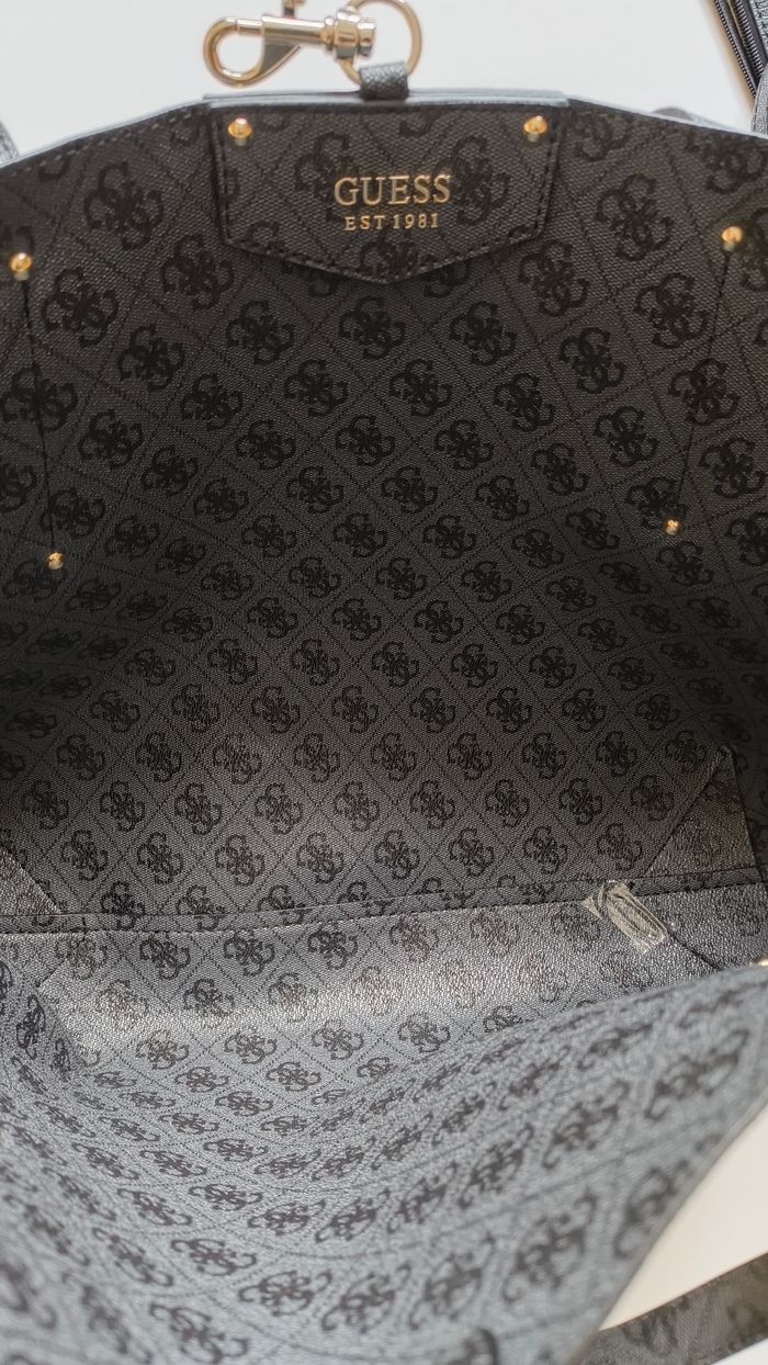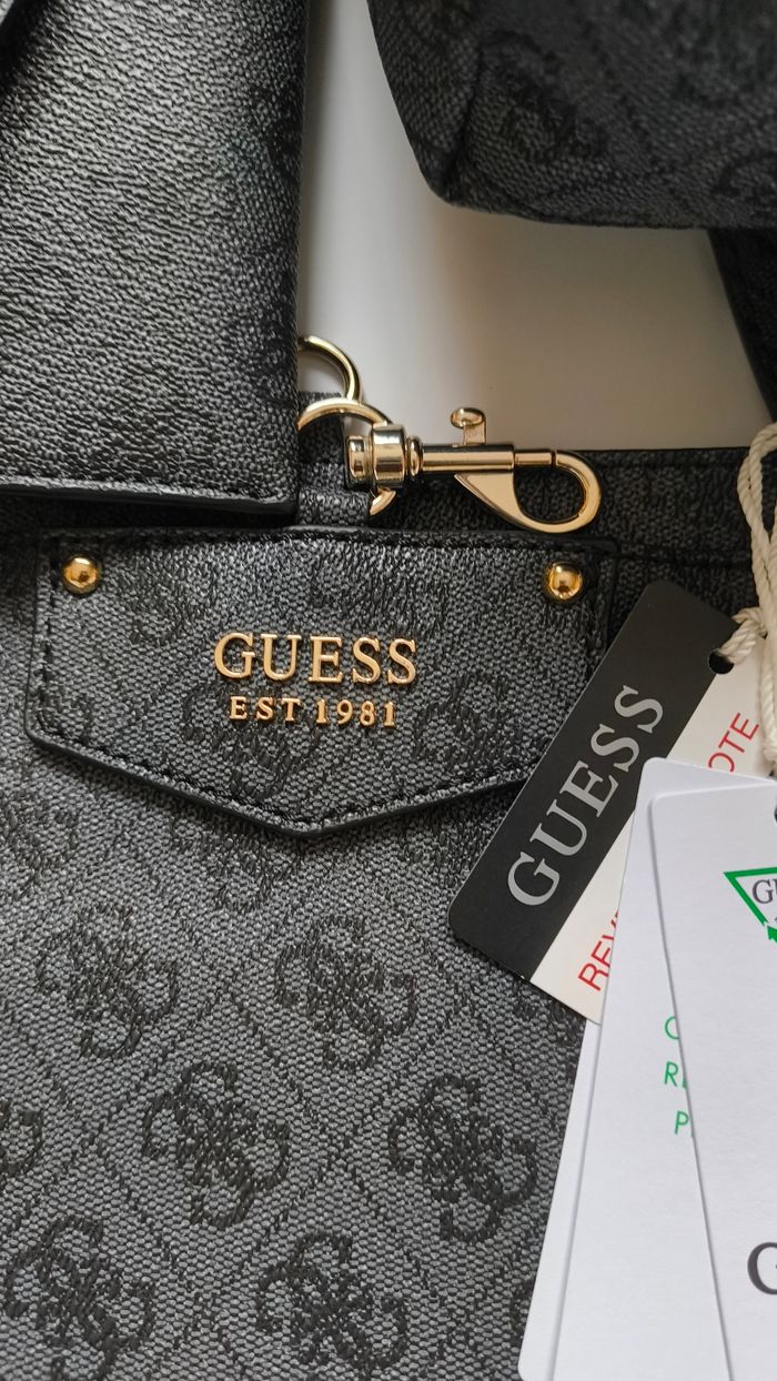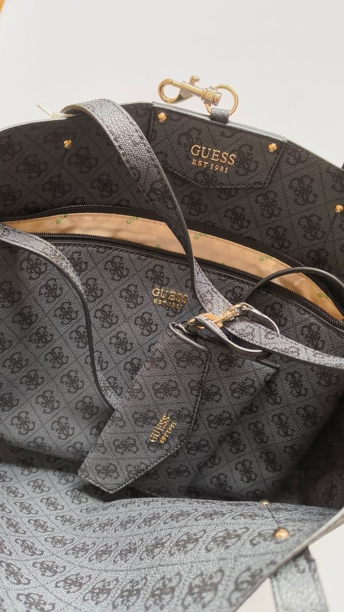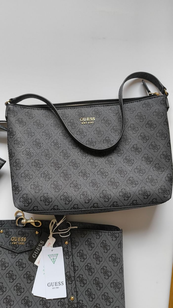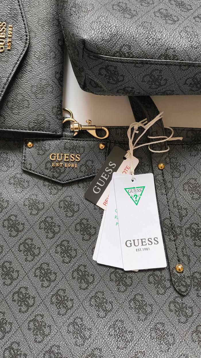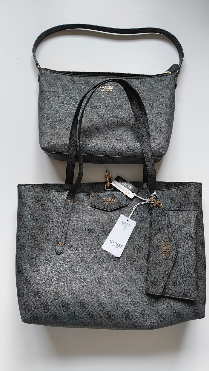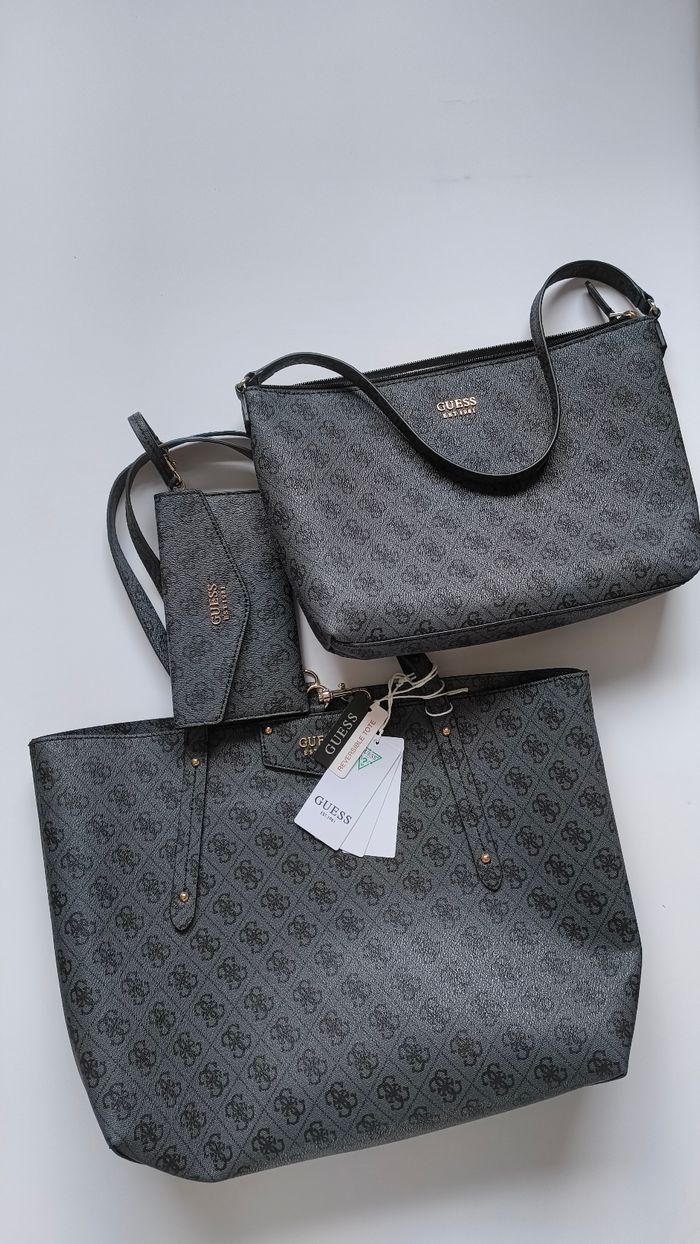 Lot de 3 sacs Guess collection brenton avec logo. Neuf avec étiquettes. Couleur gris foncé Composé d'un sac cabas de 36cm, un sac à main de 28cm et un portefeuille de 18cm